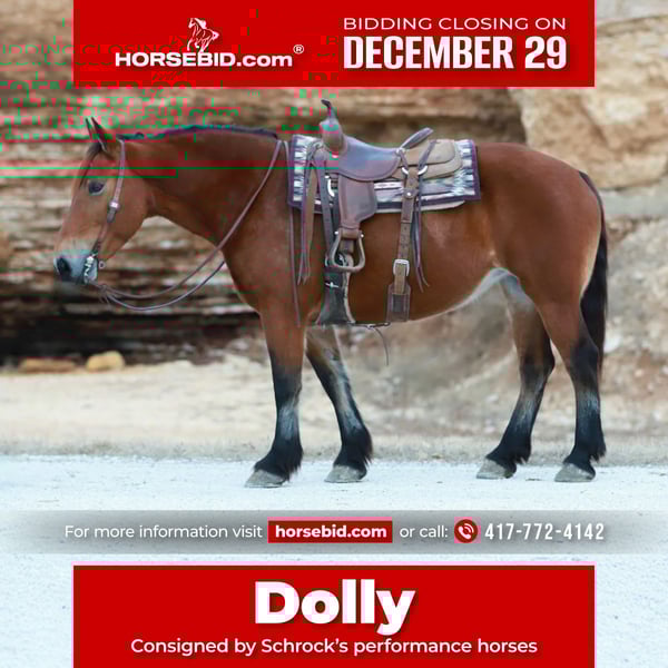 ⚜️ 𝓗𝓮𝓻𝓲𝓽𝓪𝓰𝓮 𝐖𝐢𝐧𝐭𝐞𝐫 𝓒𝓵𝓪𝓼𝓼𝓲𝓬⚜️ Happening now thru MONDAY | DECEMBER 29th - Available EXCLUSIVELY on HorseBid's website! For more details and to register visit: www.Horsebid.com CONSIGNOR CONTACT: Schrock’s performance horses 417-772-4142 LOCATION: Purdy, MO BREED: Halfdraft REGISTERED: No COLOR: Bay HEIGHT: 15.3 AGE: 7 GENDER: Mare “Dolly” is a 7 year old 15.3 hand bay draft cross mare. She is so sweet & kind natured- VERY gentle. Dolly is easy to ride and drive. She drives single or double,stays soft in your hands and is eager to please her rider. Shes been used as a mounted police / rescue horse. Been on trail rides—Nothing phases this big gal! She loves attention,Dolly stands quietly to be saddled and groomed. Sells 100% sound.