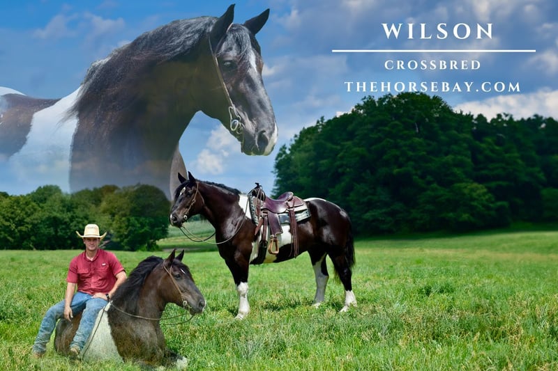 OPEN BIDDING ON THEHORSEBAY,COM. SALE ENDS ON 07/24 @ 5PM CT. More information is available on the website, including an UTD vet inspection, Coggins, video, images, and the owner's contact information to ask questions, request information, or make arrangements to come to visit. Wilson is a gorgeous 16.3 h black and white paint crossbred who is guaranteed to catch attention anywhere you go whether you are cruising down the trails or driving down the road. He has been through the natural horsemanship program learning to lay down and has excelled in it tremendously. He is no stranger to wildlife on the trailer and has been on the steepest of terrain in eastern KY and had a few trips to Michigan trail riding. He stands great to saddle, brush and fly spray. Please come and ride Wilson to experience how enjoyable he is for yourself!