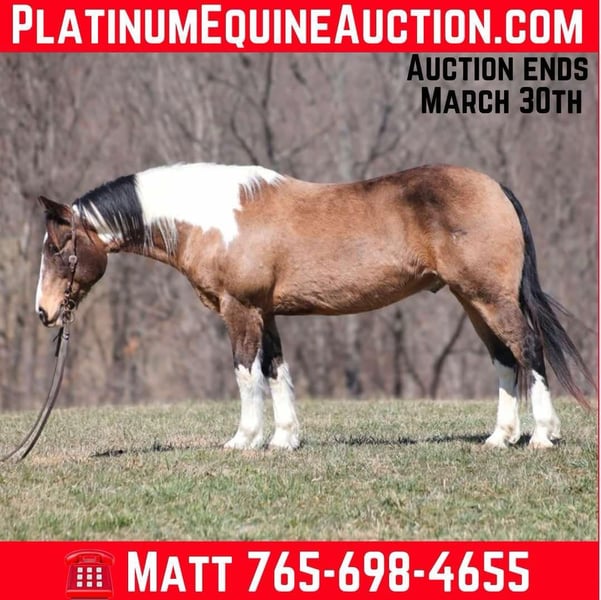 ONLINE AUCTION Place your bids at www.PlatinumEquineAuction.com Starting Bid $3500 Auction ends March 30th, 2025 Need a new saddle? Check out White Rock Saddles on our website or Facebook! Doc Holiday is a beautiful Buckskin Tobiano Paint Draftcross Gelding that is standing 15.1hh and he is a 11 years old! Doc is very stout built with a thick bone and big solid hoof, he is built for the long haul! Doc is a blue collar horse who has got up every morning and went to work making an honest living as a ranch horse. He has worked on a cow/calf operation, pasture roped/doctored/tagged. He has penned cattle at the sale barn and worked on a feedlot as well. Doc has lots of experience and is a well rounded horse that can go in any direction. He lopes nice slow circles, catches the correct leads, has a good stop and reins a circle each way. Doc is great on the trails and nothing phases him! He is content to mosey and loves going on trail rides. He will cross creeks, ditches, logs and navigate rough rocky areas. Doc has been exposed to all kinds of wildlife and will go anywhere that he is asked too. He has been rode many miles in the mountains and encountered every obstacle possible on the trail. He will go up or down even the steepest slopes, across deep creeks, over downed trees, and over all types of rough terrain while still being sure footed. Doc has been ridden down the highways and is traffic safe as well. If you want to cruise along down the trails or go out rope and tie one down Doc is a horse that will fit the bill! If you have any questions, would like to make a Buy It Now Offer or set up a Facetime Call, contact Lucky 13 Equine Matt 765-698-4655 or Lysandra 765-717-2041 Located in Brodhead, KY. ONLINE AUCTION Place your bids at www.PlatinumEquineAuction.com Starting Bid $3500 Auction ends March 30th, 2025 Need a new saddle? Check out White Rock Saddles on our website or Facebook!