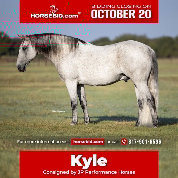 ♦️ 𝐭𝐡𝐞 𝐀𝐌𝐄𝐑𝐈𝐂𝐀𝐍 𝓕𝓪𝓵𝓵 𝓒𝓵𝓪𝓼𝓼𝓲𝓬 ♦️ Happening now thru MONDAY | OCTOBER 20th - Available EXCLUSIVELY on HorseBid's website! For more details and to register visit: www.Horsebid.com CONSIGNOR CONTACT: JP Performance Horses 817-901-6596 LOCATION: Weatherford, TX BREED: Draft Cross REGISTERED: No COLOR: Grey HEIGHT: 15.3 AGE: 13 GENDER: Gelding Meet Kyle – The Gentleman of the Trail Kyle is a stunning flea-bitten grey gelding standing 15.3 hands tall and in the prime of his life at 13 years old. With his elegant movement and classic beauty, he truly turns heads everywhere he goes. You couldn’t ask for a prettier or more well-made horse! Kyle has been a pleasure to ride and shows plenty of potential for whatever direction you’d like to take him. He’s been used primarily as a trusted trail partner—confident crossing bridges, navigating steep terrain, and splashing through water (his favorite part of the ride!). He’s been around cattle, dogs, ponies, and chickens, and handles it all with ease. This kind-hearted gelding rides out quietly alone or with company. He stands nicely for the farrier and is currently shod on all four feet. His favorite pastime is getting scratches and, of course, enjoying treats—he’s a true sweetheart. If you’re searching for a dependable, family-friendly horse who will also be your best friend and an exceptional trail companion, Kyle is the one to have in your barn. 📍 Located in Weatherford, Texas 📞 For more information, contact Jackie with JP Performance Horses at 817-901-6596. 🚛 Nationwide shipping available!