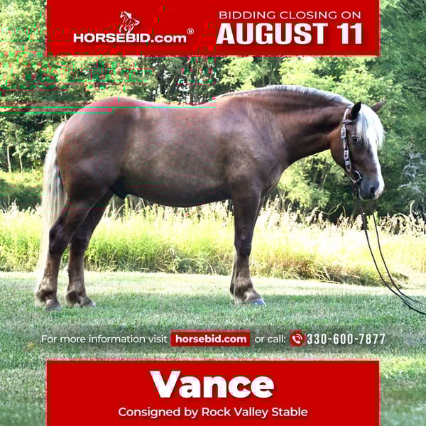 ⚜ The HERITAGE Classic ⚜ Happening now thru MONDAY | AUGUST 11th - Available EXCLUSIVELY on HorseBid's website! For more details and to register visit: www.Horsebid.com CONSIGNOR CONTACT: Rock Valley Stable 330-600-7877 LOCATION: Strasburg, OH BREED: Draft cross REGISTERED: No COLOR: Chocolate HEIGHT: 15.1 AGE: 4 GENDER: Gelding Vance is well trained to ride English or western, walk, trot, canter, and knows his leads. He been ridden in the arena and out on trail. Has been ridden by our 10 year old daughter and is very good with her . He is good for the farrier and vet . Is good to bath and clip and trailer . He is turned out at night and stalled in the daytime, and gets along with other horses. Schooling training level in dressage . Has been trail ridden alone or in a group , is very calm and easy to get along with. Is Up to date on his coggins and Flu Tetanus and Rhino shots. Sells safe and sound. Anyone is welcome to come meet Vance and take him for a ride and spent time with him call or text Dan @ 330 600 7877.