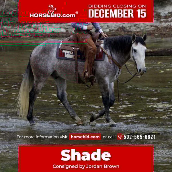 🎄𝐓𝐇𝐄 𝑯𝒐𝒍𝒊𝒅𝒂𝒚 𝐂𝐋𝐀𝐒𝐒𝐈𝐂🎄 Happening now thru MONDAY | DECEMBER 15th - Available EXCLUSIVELY on HorseBid's website! For more details and to register visit: www.Horsebid.com CONSIGNOR CONTACT: Jordan Brown 502-565-6621 LOCATION: Georgetown, TX BREED: Draft Cross REGISTERED: No REGISTERED NAME: Shade COLOR: Gray HEIGHT: 15.3 AGE: 4 GENDER: Gelding Intentionally bred for his size, demeanor, and versatility, it is by no mistake this wonderful 4yo gelding turns heads every time you back him off the trailer! Standing a sturdy 15.3 and whopping 1200 lbs with the bone and foot to last you many years and many miles. Started slow and correct with a proper education centered around good manners and an adaptable mindset toward any discipline or environment. Shade has been used to check cattle on a large yearling operation and has covered plenty of country and navigated countless types of terrain. Has been roping the sled and slow cattle on either end and shows all kinds of promise as an all around ranch horse! Not silly or spooky with no funny business. Cinch him up and go right to work! Side passes to open and close gates, rides around with a smooth and comfortable handle, and has the fundamentals that make work beyond the arena a breeze! Coming along phenomenally under dressage tack as well with tons of potential to excel in the eventing if desired! Lovely w/t/c, soft transitions, moves well off leg and has a forgiving mind. Going well over rails and xc. Shade is the type of horse that welcomes new and exciting adventures and thrives on pleasing his rider. Greets you in the pasture and is enjoyable in every aspect of horse ownership on the ground or in the saddle. Sure to make an adult ammy, promising teen, or avid cowboy their next barn favorite!