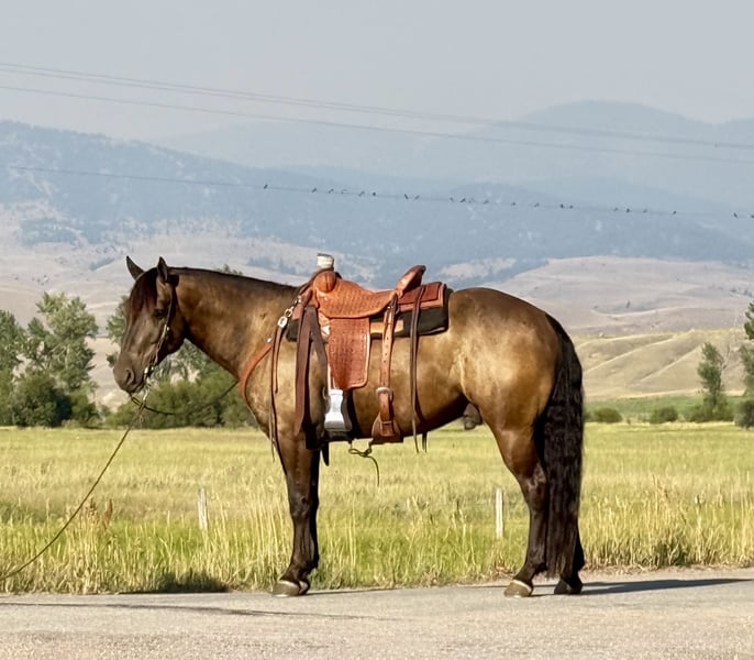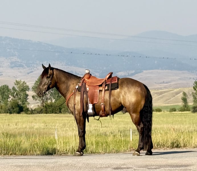 ♦️ 𝐭𝐡𝐞 𝐀𝐌𝐄𝐑𝐈𝐂𝐀𝐍 𝓕𝓪𝓵𝓵 𝓒𝓵𝓪𝓼𝓼𝓲𝓬 ♦️ Happening now thru MONDAY | OCTOBER 20th - Available EXCLUSIVELY on HorseBid's website! For more details and to register visit: www.Horsebid.com CONSIGNOR CONTACT: Flint Creek Quarter Horses 406-544-9987 LOCATION: Drummond MT BREED: Crossbred Quarter Horse REGISTERED: No COLOR: Buckskin/ Seal Brown HEIGHT: 14.3 AGE: 5 GENDER: Gelding Buddy is a 5 yr old crossbred grade quarter horse gelding that stands 14.3 hands. He is dark buckskin in the summer months and dark seal brown in the winter. He is a very friendly gentle guy that anyone that knows how to ride could get along with. He has been a ranch and trail horse his whole life doing all the ranch chores like pasture doctoring and pushing cows around. He will pull anything you can latch onto. He has a good one hand, neck rein and has all the proper buttons on him. He will step to his correct leads both directions and will lope nice circles. He will side pass to open and close gates and has a pretty good turnaround. He is trained to let you get on him off of a step or fence, simply Smooch to him and he will side pass over and make it easy for you to get on. He crosses water and all the trail obstacles and is a pleasure to ride outside. he is not buddy or barn sour and is use to riding off by himself and is the kind that will go all day and give you everything he’s got. He is a fun little gelding to ride that is fast walking and snappy when you need him to be but always quiet and gentle. He has absolutely no buck in him and is very easy to bathe, shoe, and haul. He will jump in the trailer with no problem and back out like a gentleman. This is a stout made guy with a lot of shape and bone. He’s got a big thick, wavy mane and a thick tail that drags the ground. this is a very nice young gelding at the start of his career that would make someone a great all around using Horse. Whether you want to take him to hunting camp this fall or back to the ranch, he is safe sound and ready to go to work. he is not an arena show horse by any stretch, but has been a working horse his whole life. If you think Buddy might be a good fit for you, give us a call and come and try him at the ranch. For more info call Tom at 406-544-9987