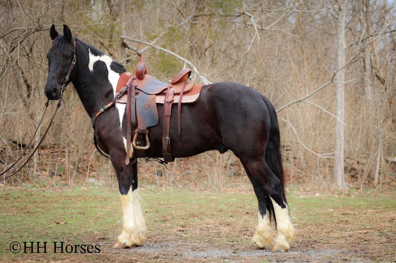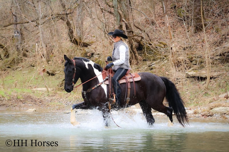 ONLINE AUCTION Place your bids at www.PlatinumEquineAuction.com Starting Bid $3500 Auction ends March 23rd, 2025 Need a new saddle? Check out White Rock Saddles on our website or Facebook! This is “PVF ROCKET”, a stunning BLACK AND WHITE REGISTERED FRIESIAN SPORT HORSE GELDING broke to ride and drive. This gelding is a handsome 15.2 hands tall. He is 4 years old and has had professional training. This nice gelding will lope circles, catch his leads, neck rein, and stop on whoa. He has been trail ridden and been through deep water, rocky stream beds, and big timber. He is well trained and well mannered. He is respectful of your space and moves off of leg cues. He has been hitched and driven to a cart and wagon. He has been through the cross country driving courses. He is traffic safe, not spooky, and he is obedient. This gelding has lots of heart, style, and presence. He is a very fun horse to ride with lots of feel in the bridle and on his ribcage. He is responsive, collected, and cool. Located in Flemingsburg, KY. For more info or to make a Buy It Now Offer contact HH Horses Erin 304-238-4155 ONLINE AUCTION Place your bids at www.PlatinumEquineAuction.com Starting Bid $3500 Auction ends March 23rd, 2025 Need a new saddle? Check out White Rock Saddles on our website or Facebook!
