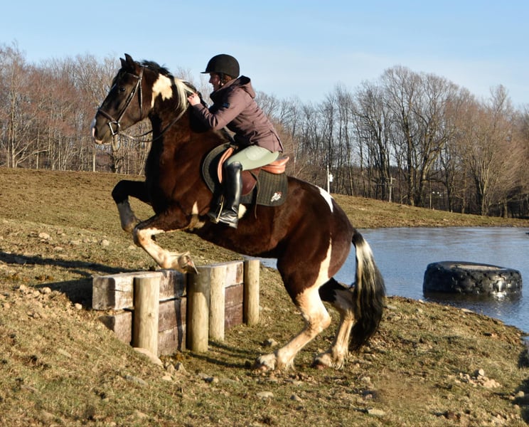 ONLINE AUCTION Place your bids at www.PlatinumEquineAuction.com Starting Bid $3500 Auction ends April 20th, 2025 Need a new saddle? Check out White Rock Saddles on our website or Facebook! O Romeo, Romeo! Here is a 4-year-old draft cross gelding, standing at an impressive 16.3 hands tall. This horse has unlimited potential and is ready to find his forever person. He is a Friesian/ spotted draft cross. This stunning gelding is indeed the whole package from head to toe! Romeo has excellent conformation, clean legs, big bones, and nice big hooves. He has a clean PPE and is ready for his next adventure in life. Romeo is a delight to work on and be around. He stands quietly for the vet and farrier and does not require stocks. He will stand patiently tied while you brush and saddle him up. Romeo loads easily and rides calmly in the trailer; he unloads quietly and is ready to work. He is easy to bathe and pamper and is content in a stall or turned out to pasture. Under saddle, Romeo is a very uncomplicated ride. He is soft laterally, has an excellent “whoa,” moves off your leg nicely, and has a nice back, side passes, and spins. Kids, teens, and adults have ridden him, and they all enjoy him; he can take a joke and will try anything you ask! He recently went to Equifest, where a youth rode him in an opening ceremony carrying a flag. We have been riding him both English and Western and have found he is versatile and happy in both disciplines. He is quiet and confident on the trail and will go anywhere you point him. He easily navigates rough terrain up and down grades, through water, over downed trees, and trailblazing through the woods. He has been exposed to cows, dogs, goats and sheep. He recently went on a week-long trail-riding camping trip to Kansas and loved it. Romeo will trot poles and take a jump with ease. Don’t feel like riding? Then take him for a drive! Romeo hooks quietly and drives off calmly. I believe this gelding would make an excellent mount for anyone looking for a quiet and simple horse to take from the arena to out on the trail and even into the show pen; his willing mind and calm demeanor make him a super adaptable and easy horse to get along with no matter the level of rider/handler. He sells sound without vices or limitations. We are located in Warsaw, NY. Contact Dayton Wolcott for more information 585-734-0169 ONLINE AUCTION Place your bids at www.PlatinumEquineAuction.com Starting Bid $3500 Auction ends April 20th, 2025 Need a new saddle? Check out White Rock Saddles on our website or Facebook!