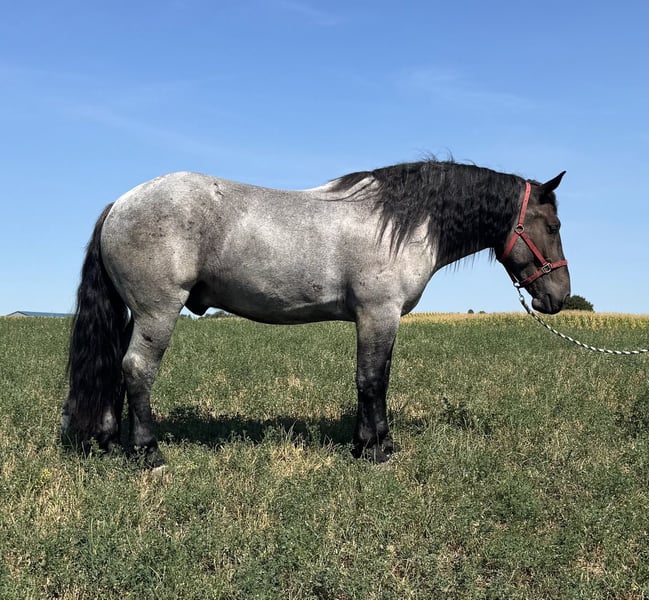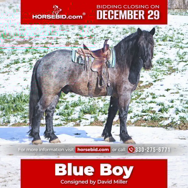 ⚜️𝐓𝐇𝐄 𝓗𝓮𝓻𝓲𝓽𝓪𝓰𝓮 𝐖𝐢𝐧𝐭𝐞𝐫 𝓒𝓵𝓪𝓼𝓼𝓲𝓬⚜️ Happening now thru MONDAY | DECEMBER 29th - Available EXCLUSIVELY on HorseBid's website! For more details and to register visit: www.Horsebid.com CONSIGNOR CONTACT: David Miller 330-275-6771 LOCATION: Millersburg, OH BREED: Blue Roan Draft REGISTERED: No COLOR: Blue roan HEIGHT: 17 AGE: 5 GENDER: Gelding Blue Boy 🌟 UNICORN ALERT! Truly One-of-a-Kind 5YO Blue Roan Draft Gelding – 17 Hands of Perfection! 🌟 Are you searching for the horse of your dreams? Look no further – this stunning blue roan draft gelding is the total package! At just 5 years old and 17 hands, he turns heads wherever he goes with his sharp, eye-catching looks. But it’s his heart-melting sweet personality that will steal yours forever. He’s the barn favorite everyone fights over – a true big baby who craves attention and gives it back tenfold! Super broke and versatile for ANYONE: • Ride him English, Western, or bareback – he’s bombproof and gentle! • Drive him single or double – hitches up like a pro with ease! • Traffic safe, trail champion: Crosses logs, splashes through water, powers through brush without flinching. • Moonlight rides? Wagon trains? He’s been there, done that, and loves every minute! Kid-friendly, beginner-safe, and a joy to handle: • Easy to tack up, hitch, bathe, and shoe – good for the farrier every time. • Gets along with horses, ponies, dogs, and everyone in between. • No vices, no drama – just pure love and reliability. This isn’t just a horse… he’s THE UNICORN people dream about owning! Safe, sane, and spectacular – perfect for family fun, trails, driving, or showing off at events. Don’t miss your chance to call this rare gem YOURS!