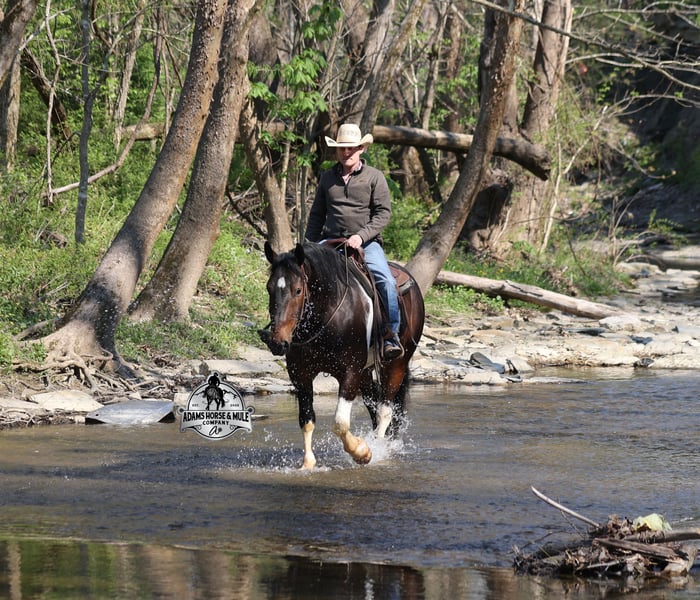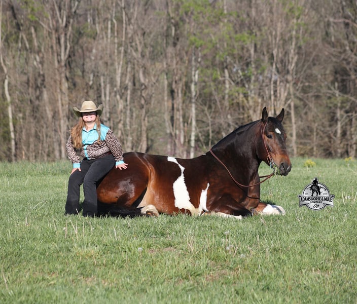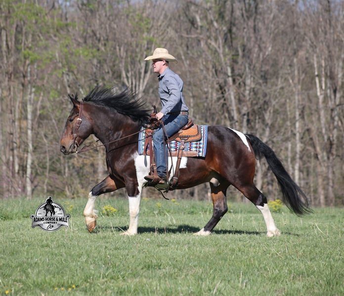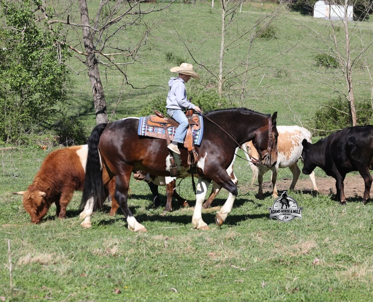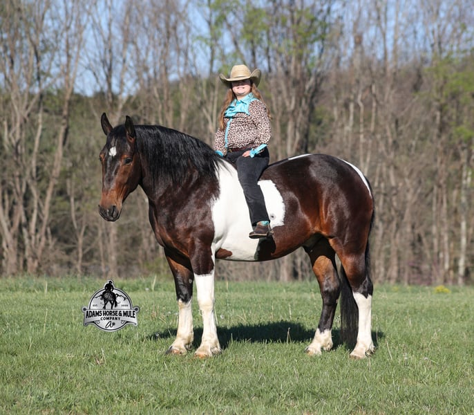 Go to visit our website for more pics and video link at www.AdamsHorseAndMuleCo.com AHAMC has been in the horse business and sold horses over the internet since 2005. We have a long track record of success with hundreds of happy customers. We work hard to match riders with the correct horses and specialize in beginner safe, family friendly horses that have been used and checked out by our family! We can set up transportation anywhere in the US and look forward to working with you. Cherokee looks like something straight out of a fairy tale with his muscular build, beautiful color pattern and he is even better in person! This Draftcross gelding is a beautiful bay tobiano, that is weighing in around 1450lbs and stands around 15.3H! He is 5 years old and is very well built. Cherokee has been through out natural horsemanship program, knows how to lay down on command, has the friendliest personality, loves attention and is everyone’s best friend. He has done it all… From riding around town and through the bank drive-thru, Cherokee will go anywhere that he is asked. He has been ridden around the ranch, checked cows and rode fences. He is a slow and laid back type of horse that will just ease along down the trails with no hesitation. Cherokee is a horse that the whole family will love and one that will help build everyone’s confidence levels! He has been camping in several states and has been ridden by all ages of beginners and kids as well. When out on the ranch or going down the trails he will cross creeks, ditches, logs and navigate rough rocky areas. He has been exposed to all kinds of wildlife such as deer or turkey. He has been worked under harness to all types of farm equipment and is traffic safe whether that be trucks or cars. Cherokee has a nice jog, his lope is slow, collected and very easy to set as he lopes nice circles! He has been ridden English and goes over the jumps with ease. Cherokee is the total package and he will take care of you! Feel free to call Eric 606-308-2461 with any questions!