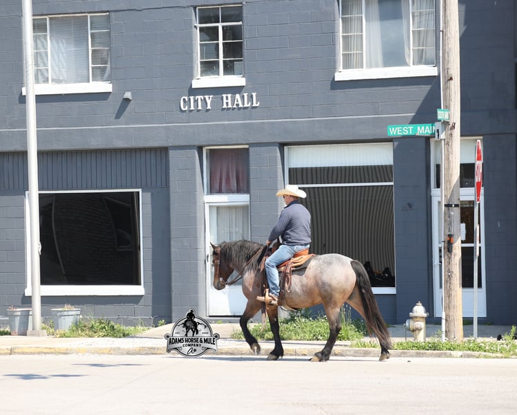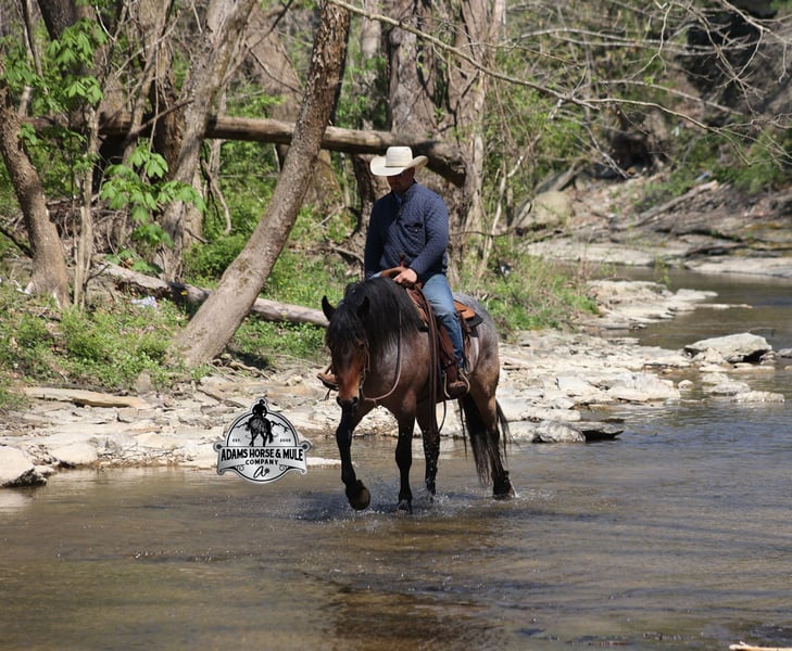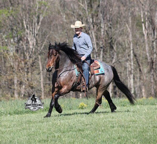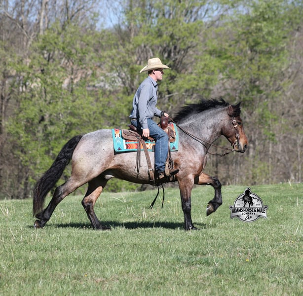 Go to visit our website for more pics and video link at www.AdamsHorseAndMuleCo.com AHAMC has been in the horse business and sold horses over the internet since 2005. We have a long track record of success with hundreds of happy customers. We work hard to match riders with the correct horses and specialize in beginner safe, family friendly horses that have been used and checked out by our family! We can set up transportation anywhere in the US and look forward to working with you. Clover is just as sweet as his name suggest! He is an awesome looking 15.2h, Bay Roan Draftcross gelding! He is 5 years old and is a sturdy built horse. Clover came from the same breeding farm that a lot of our draftcrosses come from and with that farm we find the constant quiet, gentle, laid back temperament that makes them such good family safe trail horses! Clover is no exception to that statement as he is a super quiet, gentle, laid back type of horse that is going to suit any rider and help build your confidence. Not to mention he is very friendly as well! Clover can do a variety of things from pulling carriages, to ranch work or trail rides. Clover has been on camping trips, been ridden in several states and has been ridden by all ages of beginners. We took him on a week long trip to Texas and Missouri back in March as an extra for some of our friends (total beginners!!!) to ride around an exotic ranch. Clover saw Bison, Water Buffalo, Emu, Ostriches, Camels, Nilgai, Blesbok, Ibex, Rusa, Corsican, Zebra, and even got chased by a herd of Wildebeest(they are mean little critters!) We even rode on the beach of the Barzos River and across it as well. But nothing phased Clover! When out on the ranch or going down the trails, he will cross creeks, ditches, logs and navigate rough rocky areas. He is safe in traffic safe whether that be trucks or cars. He’s been ridden around the ranch, checked cows and rode fences. Clover moves very smoothly, as he has a nice jog, his lope is smooth as well and he lopes nice circles on a loose rein! He has been ridden English and goes over the jumps with ease. If you want a sweet guy who will be your best friend, Clover will fit the bill! Feel free to call Eric 606-308-2461 with any questions!