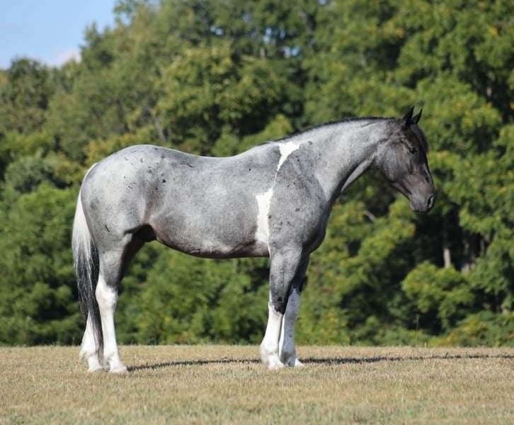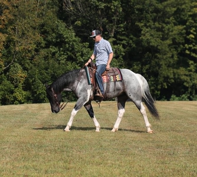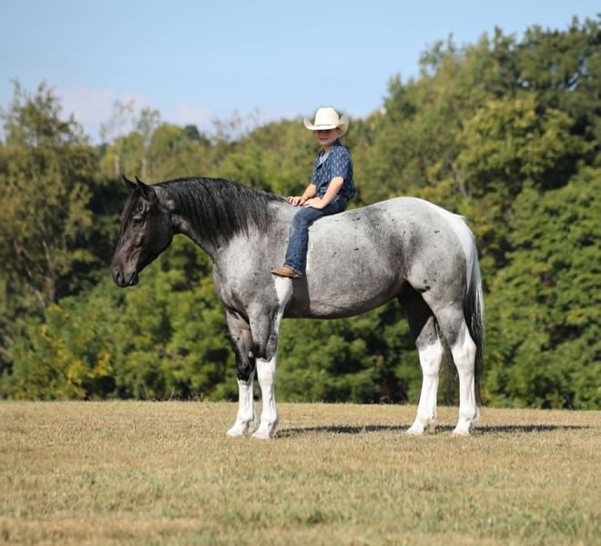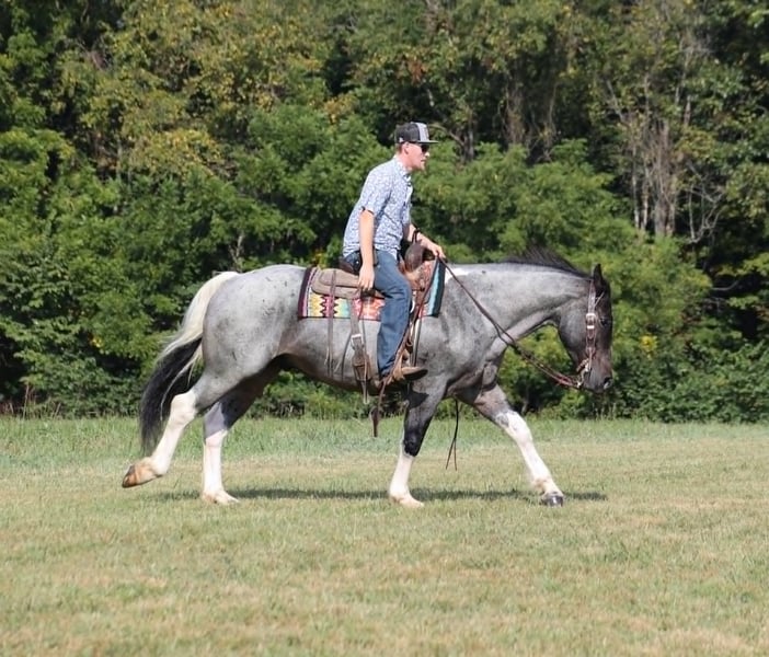 Poncho is as cool as he is different! This draftcross gelding stands around 15.3hh that will weigh around 1400lbs and he is a 5 years old. Poncho is a rare blue roan tobiano!!! Poncho is everyone’s best friend as he loves attention and is very calm natured. He is out of the same breeding program as several other top draftcross geldings that we have had over the last 5 years and every one of them has the right mind with the calm nature that makes them great family horses. Poncho has been ridden by every member of our family all the way down to our 7 year old daughter. He has been ridden down the highways and he is traffic safe as well. Poncho is great on trails and he will cross creeks, ditches, logs and navigate rough rocky areas. He has a smooth jog, a VERY VERY nice easy to set lope and a good stop! He neckreins around and backs with ease. He has been exposed to all kinds of wildlife such as deer or turkey or other animals like cows or dogs and will go anywhere that he is asked too. He has been ridden many miles in the mountains of Eastern Kentucky and encountered every obstacle possible on the trail. He will go up or down even the steepest slopes, across deep creeks, over downed trees, and over all types of rough terrain while still being sure footed. Poncho is not cinchy, cold backed, does not crib or weave. In addition to riding, Poncho has also been worked in farm machinery as well. He is the horse of a lifetime, don’t miss him!!! Feel free to contact me +13039908552