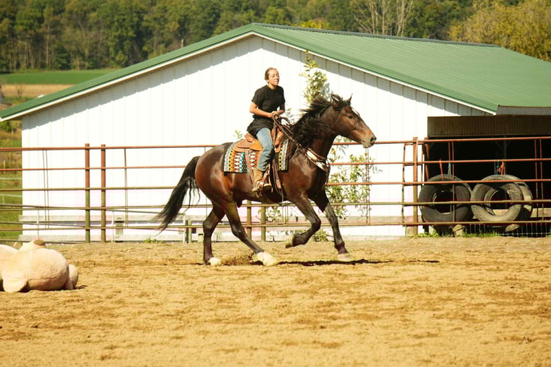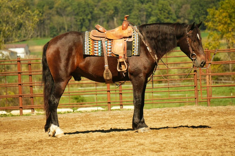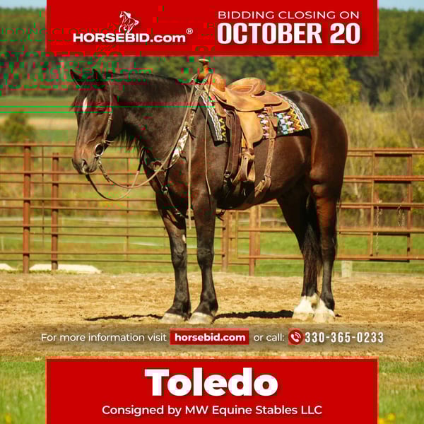 ♦️ 𝐭𝐡𝐞 𝐀𝐌𝐄𝐑𝐈𝐂𝐀𝐍 𝓕𝓪𝓵𝓵 𝓒𝓵𝓪𝓼𝓼𝓲𝓬 ♦️ Happening now thru MONDAY | OCTOBER 20th - Available EXCLUSIVELY on HorseBid's website! For more details and to register visit: www.Horsebid.com CONSIGNOR CONTACT: MW Equine Stables LLC 330-365-0233 LOCATION: Fresno, OH BREED: Draft QH Cross REGISTERED: No COLOR: Bay Roan HEIGHT: 16 AGE: 5 GENDER: Gelding Toledo 5-year-old Draft × Quarter Horse Gelding 16.H 1,200lbs. He’s the total package—good-looking, versatile, and willing—ready to ride, drive, go English or Western… he truly does it all. All around family horse, beginner safe. Toledo has the quiet, easy-going nature of a Draft paired with the athleticism of a Quarter Horse, making him a dream partner for almost any job. He willingly walks, trots, and canters balanced circles. Recently started over jumps, Toledo took to it like he’d been doing it all his life—making him a great candidate for eventing, fox hunting, or simply being your steady, reliable family horse. Out on the trail, Toledo is solid and dependable for riders of all levels. He’s ponied other horses as well , crossed logs, ditches, and creeks without hesitation, and always keeps that same calm, head-level composure. Toledo also drives and has confidently navigated busy roads and heavy traffic. On the ground, he’s as sweet as they come—always at the gate to greet you, soaking up attention, and happy to be around people. He’s been exposed to dogs, cattle, and all the usual farm life without a fuss. He’s sound and clean, no vices, and excellent for shoeing, clipping, loading, and hauling. If you’re looking for a handsome, kind-hearted partner who can truly do it all, Toledo is ready to meet you. Contact Marcus @ 330-365-0233