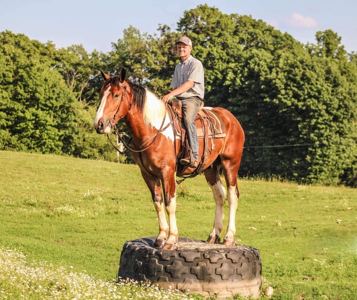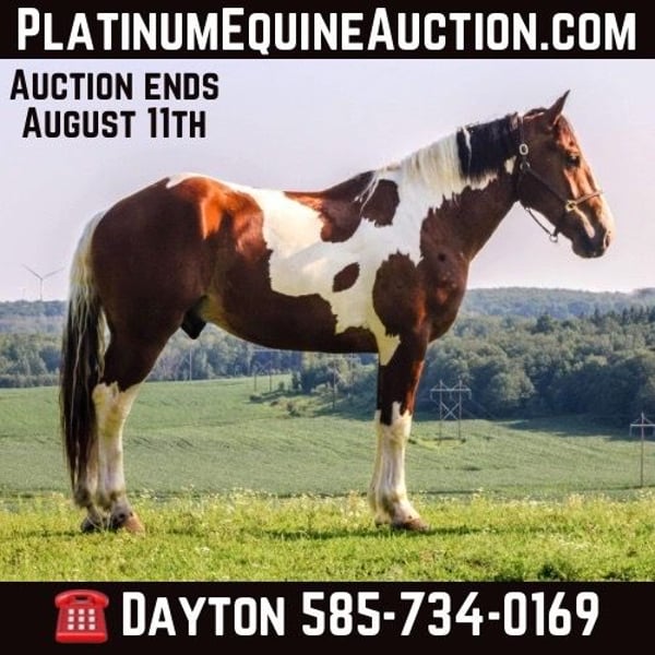 ONLINE AUCTION Place your bids at www.PlatinumEquineAuction.com Starting Bid $3500 Auction ends August 11th, 2024 Need a new saddle? Check out White Rock Saddles on our website or Facebook! Big Ben is the true definition of a gentle giant, standing at 17hh and just 4 years old! For his size, he is sure-footed walking through the woods or crossing any ditches. Big Ben will w/t/c on the correct leads in the arena. We have put him through our obstacle course, and he easily passed everything! Big Ben is traffic-safe and good with tarps, stock whips, and bridges. He will side-pass and back up with ease! We have taken him to the kid’s camp, where we teach beginners how to ride, and he does well with all ages. Big Ben will trail ride alone or in a group and go anywhere you point him. If you don’t want to ride, Big Ben also drives. He will drive down the road with cars passing by and not even lift his head. He is easy to hitch and stands quietly. Big Ben stands good for the vet, clipping, and bathes. He sells 100%sound with no vices. We welcome you to come out to the farm and try him out. Contact Dayton Wolcott 585-734-0169 for more information on Big Ben. Located in Warsaw, NY. ONLINE AUCTION Place your bids at www.PlatinumEquineAuction.com Starting Bid $3500 Auction ends August 11th, 2024 Need a new saddle? Check out White Rock Saddles on our website or Facebook!