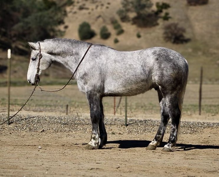 ONLINE AUCTION Place your bids at www.PlatinumEquineAuction.com Starting Bid $3500 Auction ends March 16th, 2025 Need a new saddle? Check out White Rock Saddles on our website or Facebook! Cosmo is a stunning dapple grey draft cross that is waiting to become your new best friend. At 6 years old, standing at 15 hands with a big thick bone and solid foot, he has the perfect combination of beauty and build. It’s impossible not to fall in love with this sweet boy. One of Cosmo’s strongest qualities is his ability to be an excellent trail partner. He navigates any terrain with ease and is sure-footed on even the most challenging trails. Ditches, brush, and wildlife are all just a part of his routine. You can trust him to take you safely up or down any trail without hesitation. In the arena, he has a comfortable trot, smooth lope, and a picture-perfect sliding stop. He has also been introduced to trail obstacles and he confidently tackles bridges, tires, and even walking through a car wash. We have also taken Cosmo out to gather cattle and check pastures. He takes each outing in stride and seems to truly enjoy every adventure we take him on. This friendly horse will meet you at the gate with excitement and loves nothing more than getting pampered especially with belly scratches. Cosmo is an absolute pleasure to handle as well. He stands patiently for clipping and bathing, ties quietly, loads easily into trailers, and hauls like a pro. We have even ridden him down busy streets where he didn’t bat an eye at passing cars or trucks. With his pretty movement, Cosmo would look stunning in English tack too. Whether you’re looking for a reliable trail horse or one that excels in different riding disciplines, this boy is truly versatile. If you want an easy-going horse that anyone can ride, then Cosmo is definitely the rare find you’ve been searching for. He thrives in both pasture settings or stalls; it doesn’t matter to Cosmo as long as he has a loving home. If you’re ready for lifelong adventures with your next equine partner, then Cosmo is the perfect match for you. Please contact us at Longhorn Ranch and ask for Dina at 831-537-1915. We are located in Paicines, California, and would be more than happy to introduce you to this incredible horse. ONLINE AUCTION Place your bids at www.PlatinumEquineAuction.com Starting Bid $3500 Auction ends March 16th, 2025 Need a new saddle? Check out White Rock Saddles on our website or Facebook!