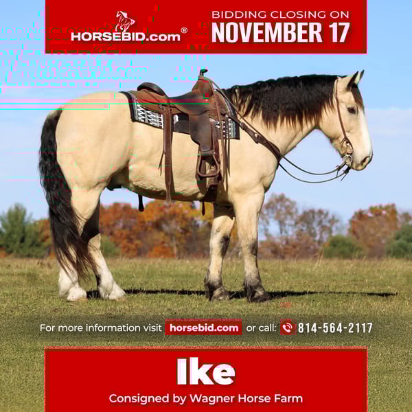 🎲𝓽𝓱𝓮 𝐑𝐈𝐃𝐄𝐑'𝐒 𝓒𝓱𝓸𝓲𝓬𝓮🎲 Happening now thru MONDAY | NOVEMBER 17th - Available EXCLUSIVELY on HorseBid's website! For more details and to register visit: www.Horsebid.com CONSIGNOR CONTACT: Wagner Horse Farm 814-564-2117 LOCATION: Clarion, Pa BREED: Draft Cross REGISTERED: No COLOR: Buckskin HEIGHT: 15.2 AGE: 7 GENDER: Gelding Meet Ike !! Ike is a 7 Year Old Super Cool , One of a Kind Buckskin Draft Cross Gelding! Wow Check Him Out!! They Dont Come Any Prettier Than Ike! Not only is Ike super pretty but he is also super good broke to ride! He will one hand neck rein, side pass, open shut gates, nice head set and lope right off. He has performed all aspects of work on the ranch and is a very seasoned when it comes to being a ranch horse and working cattle. From checking fences to roping and doctoring cattle and dragging calves to the branding fire. I have trail ridden Ike all over and he is a great trail horse. Watch Ike cross the big creek on a 40 degree morning in the deep water. He is as seasoned and broke as you will find a horse on the trail, ranch or outside in the big wide open. Ike also rides very nicely in the arena and could even be a good English riding horse prospect. The sky is the limit really for Ike he could go in any direction. When i first got Ike he was a little unsure about handling his hind feet and ears but he has gotten a lot better with all that. Ike originally worked on a large cattle operation and that job made him very seasoned and dependable on the trail and ranch. He is one of the brokest draft crosses i have ever had the privilege to ride or own. Whoever buys him is getting a once in a life time type of horse. Dont miss out on this super nice buckskin draft cross gelding. We can help arrange shipping anywhere in the United States. Call or Text Glory at 814-564-2117 Thank You and God Bless