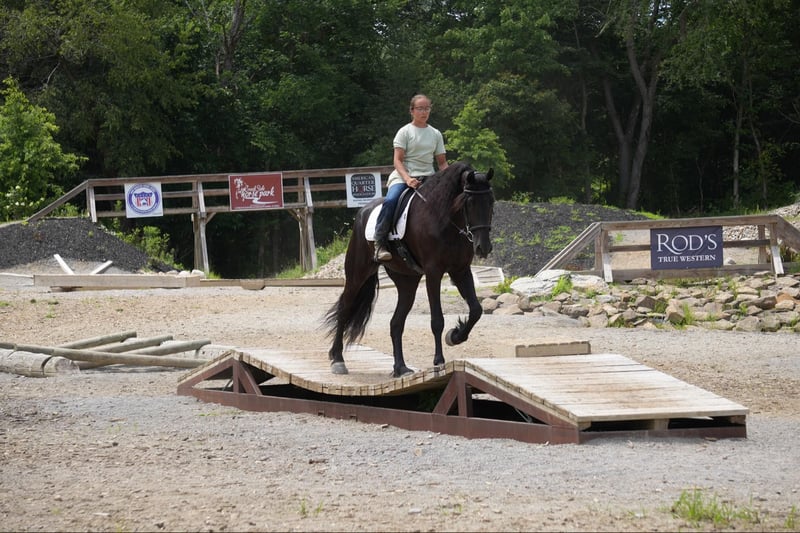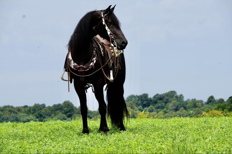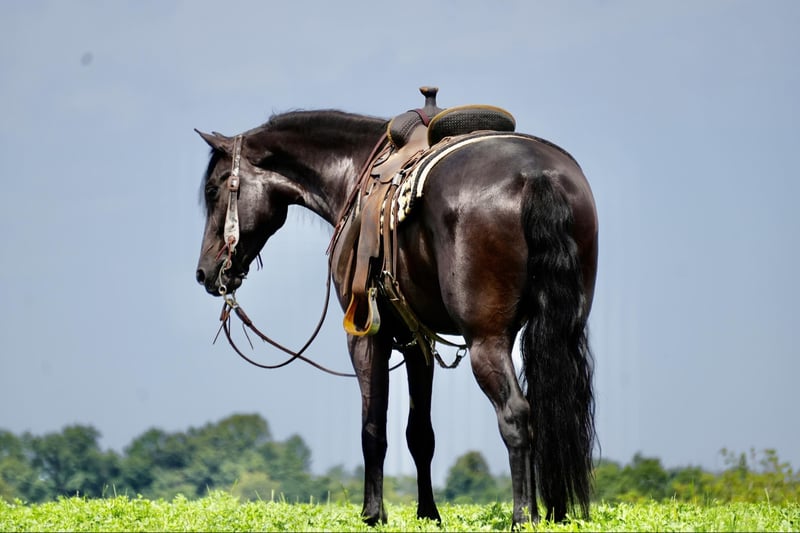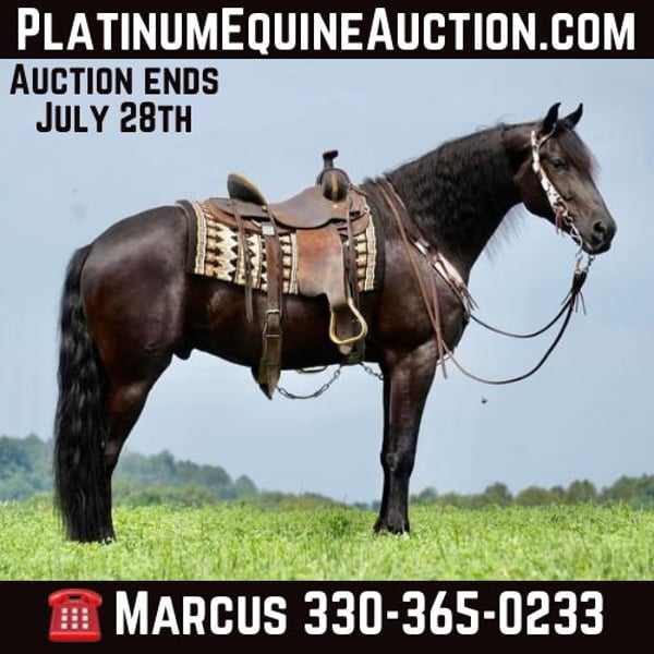ONLINE AUCTION Place your bids at www.PlatinumEquineAuction.com Starting Bid $3500 Auction ends July 28th, 2024 Need a new saddle? Check out White Rock Saddles on our website or Facebook! Perfection, that is what you will think when you gaze upon this beauty. Jackson is a 5 year old, Strong 16.2 hand gorgeous Reg. Friesian cross gelding. He is a solid citizen that catches the eye of all who see him. He is a true all around horse for anyone to enjoy no matter if they want a fantastic riding partner, or they need a sensible equine partner, or they want to hitch him up to that epic carriage for a quiet relaxing drive down the road. He is a beautiful deep black coat with long flowing hair for days. He has a great personality and loves all the snuggles you give him. He is a very solid and trail horse. He has a great walk, a very nice trot and canter. He has been on countless trail rides in all different types of terrain. He crosses water of all kinds and will walk over bridges. Jackson is definitely a horse that you will wear your tires off looking for, as he is a once in a lifetime type of horse. He is tarp safe and doesn’t mind the ball at all, loves obstacles, and has been on tons of trails and he does great. He really loves his down time with his person and loves to play with the big ball together. Jackson is a horse that we know you will fall in love with, he does not need to be in any type of program or ridden every day to be the same horse for you when you get him out. He can be kept in a stall and also does great on pasture and is super easy to catch. He stands well in the cross ties and really loves attention. He is wearing shoes all around and does wonderful for the farrier. If you feel this is the horse for you, please feel free to contact us or come see him in person! Contact Marcus Weaver 330-365-0233 Located in Fresno, OH. ONLINE AUCTION Place your bids at www.PlatinumEquineAuction.com Starting Bid $3500 Auction ends July 28th, 2024 Need a new saddle? Check out White Rock Saddles on our website or Facebook!