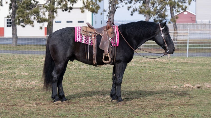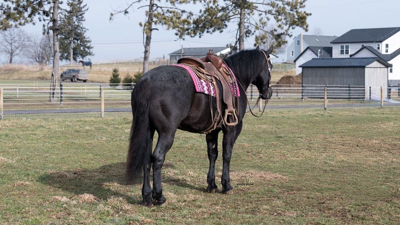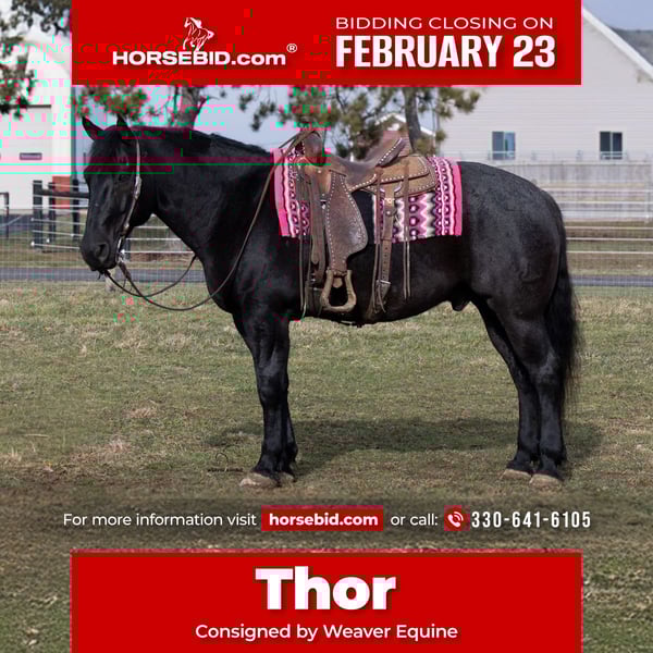 💎 𝐓𝐇𝐄 𝓓𝓲𝓪𝓶𝓸𝓷𝓭 𝐒𝐇𝐎𝐖𝐂𝐀𝐒𝐄 💎 Happening now thru MONDAY | FEBRUARY 23rd - Available EXCLUSIVELY on HorseBid's website! For more details and to register visit: www.Horsebid.com CONSIGNOR CONTACT: Weaver Equine 330-641-6105 LOCATION: Fredericksburg Ohio BREED: Draft cross REGISTERED: No REGISTERED NAME: Thor COLOR: Blue roan HEIGHT: 15.3 AGE: 8 GENDER: Gelding Here's a pretty blue roan draft cross gelding. Thor is 8 years old and loves his job! He is an excellent rider, who is calm , collected and easy going. He is spectacular under both English and Western disciplines. He loves the work , and does a great job too. He will happily take a few jumps! He will ride well both indoors and outdoors. He will lope a circle in the arena. He will pick up both leads correctly. He will neck rein and sidepass easily. Rides with or without a bridle. Stops and backs up nicely when asked. He will stand at a mounting block. Friendly temperament! He does great on the outside as well. He loves to trail ride. He will ride out nicely alone as well as with other horses. He will cross creeks and step over logs with ease. He is traffic safe. He will stop and stand at a stop sign. He is a doll in the barn as well. He does great when turned out with other horses. He is easy to catch in the stall. He will stand nicely whether he is ground tied or in the cross ties. He does not mind being tacked or groomed. Stands nicely to bathe and for the farrier. Picks up all four feet nicely. Easy on the lead line. He will lunge nicely. Trailer loads well. This pretty guy has all the experience. He is 100% sound and requires no maintenance.