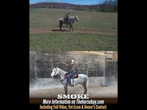 Dapples the size of apples! Just try to count the dapples on this guy! Smokey is a stout-built draft cross gelding standing around 15.2hh. He will weigh 1250lbs, is 9 years old, and has that super pretty dapple grey coloring with a silver mane and tail! He is one cool-looking guy! Not only does he look cool, but he also has all of the other boxes checked… he is Mr. Personality, as friendly as they come, loves attention, and is very calm-natured. Smokey has been in our program since last year and has completed the natural horsemanship training and does some liberty work and he also knows some tricks, he will bow, lay down and set on his rump. Every member of our family has ridden Smokey, all the way down to our 7-year-old. Smokey is great on trails, and he will cross creeks, ditches, logs, and navigate rough, rocky areas. He has a smooth jog, a VERY VERY nice, easy-to-set lope, a good stop, turns a circle both ways, and backs with ease! He has been exposed to all kinds of wildlife, such as deer, turkey, cows, and dogs, and will go anywhere he is asked to. He has ridden many miles in the mountains of Eastern Kentucky and encountered every obstacle possible on the trail. He will go up or down even the steepest slopes, across deep creeks, over downed trees, and over all types of rough terrain while still being sure-footed. Smokey is not cinchy, cold-backed, and does not crib or weave. In addition to riding, Smokey has also been driven down the highways. Smokey is a super cool horse that anyone is sure to love!!