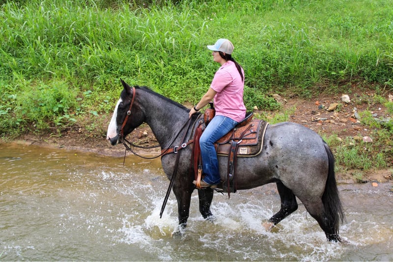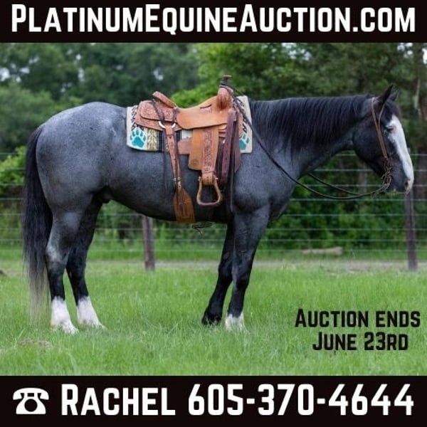 ONLINE AUCTION Place your bids at www.PlatinumEquineAuction.com Starting Bid $3500 Auction ends June 23rd, 2024 Need a new saddle? Check out White Rock Saddles on our website or Facebook! Indigo is a 7 year old BLUE ROAN draftcross gelding, He stands 16.1 hands tall and is a gentle giant! Indigo has been used for a little bit of everything! He has been trail rode all over, been hauled to state parks, he has been hunted off of in the mountains, he has also been packed off of. Indigo does great in any type of terrain, He crosses the creeks, bridges , and logs with no hesitation. Indigo has also spent countless hours on the ranch and in the sale barn doing all aspects of ranch work. He has been used to rope and doctor cattle outside, he has also been used to gather and sort cattle. Indigo has been used at the sale barn for pushing and sorting cattle as well! Indigo is super gentle and quiet, he has a sweet puppy dog personality and wants to be everyones friend! If your looking for a fancy crossbred that you can do anything on be sure to check Indigo out! He is located in Rusk TX, Nationwide shipping is available! Call or text TR Livestock Rachel 605-370-4644 for more info. ONLINE AUCTION Place your bids at www.PlatinumEquineAuction.com Starting Bid $3500 Auction ends June 23rd, 2024 Need a new saddle? Check out White Rock Saddles on our website or Facebook!