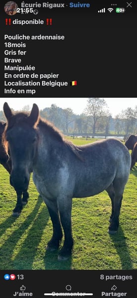 Magnifique pouliche ardennaise gris fer 18 mois très brave idéal pour loisir ou élevage
