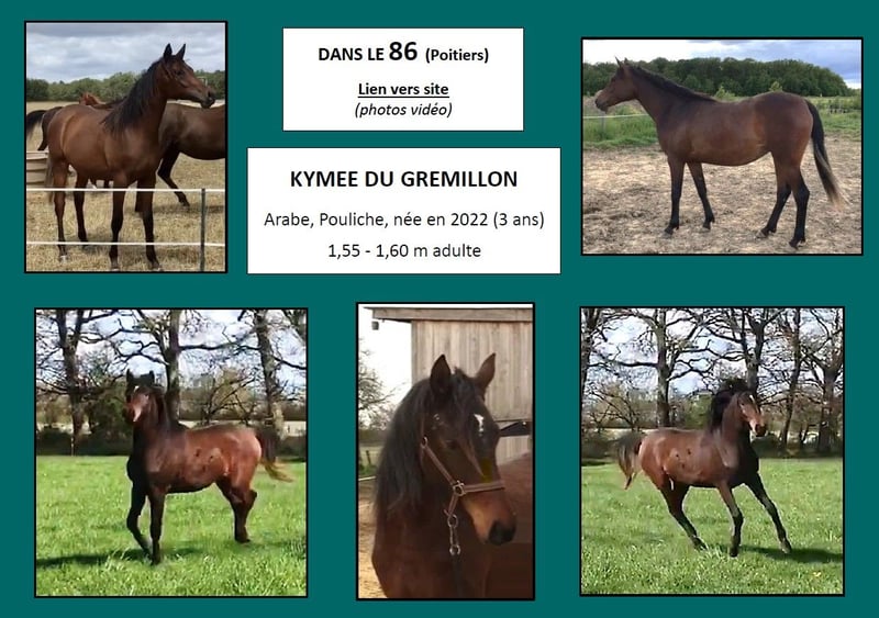 Zeker tussen de 1,55 en 1,60 m op volwassen leeftijd, heeft deze merrieveulen een kastanjebruine vacht die zeker donkerder zal worden met de leeftijd. Ze is drager van het Dun-gen dat door haar vader is doorgegeven. Een aanstormend sporttalent, ze heeft een harmonieuze en elegante bouw met een fijne en hooggeplaatste hals. Haar gangen zijn luchtig en licht met veel ruimte en balans. Dynamisch en zeer levendig, toont Kymee een evenwichtige, zelfverzekerde en nieuwsgierige karakter. Haar veelzijdigheid, behendigheid en levendigheid zullen voordelen zijn in sportdisciplines zoals springen, dressuur, eventing of endurance. Ze is sinds maart 2025 zadelmak en wordt ook gewerkt in vrijheid, aan de hand en met lange teugels. Haar prijs evolueert met de voortgang van het werk. Zoals al onze paarden is dit merrieveulen gevaccineerd, ontwormd, aanvullend gevoed en regelmatig gecontroleerd op tandheelkunde en osteopathie. Al onze veulens worden gehanteerd, in groepen opgevoed en vooral laat gespeend rond de 10 of 11 maanden voor hun evenwicht. Verschillende andere paarden zijn te koop op de fokkerij en zijn zichtbaar op de website van Haras du Grémillon. Aarzel niet om contact op te nemen via SMS voor meer informatie.