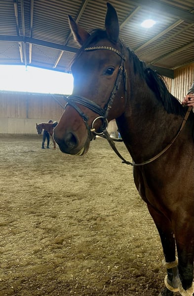 For sale is a lovely 4-year-old mare (height approximately 1.57 m). Due to a lack of time, we are looking for a new home for our young mare. She is backed and currently in further training. Unfortunately, we cannot support her as much as she deserves due to time constraints. She shows a strong willingness to learn and is very attentive. With further training, she certainly has potential for leisure riding or even show jumping. We wish for her to find a place where she can be individually further developed. Character & Traits: - People-oriented & friendly - Brave and unflinching - Eager to perform with joy in her work Field of Use: Perfectly suited as a leisure partner for someone who wants to continue working with her. Additionally, she is very interesting for breeding or show jumping due to her lineage. She is being offered solely due to time constraints, as our daughter is starting university.
