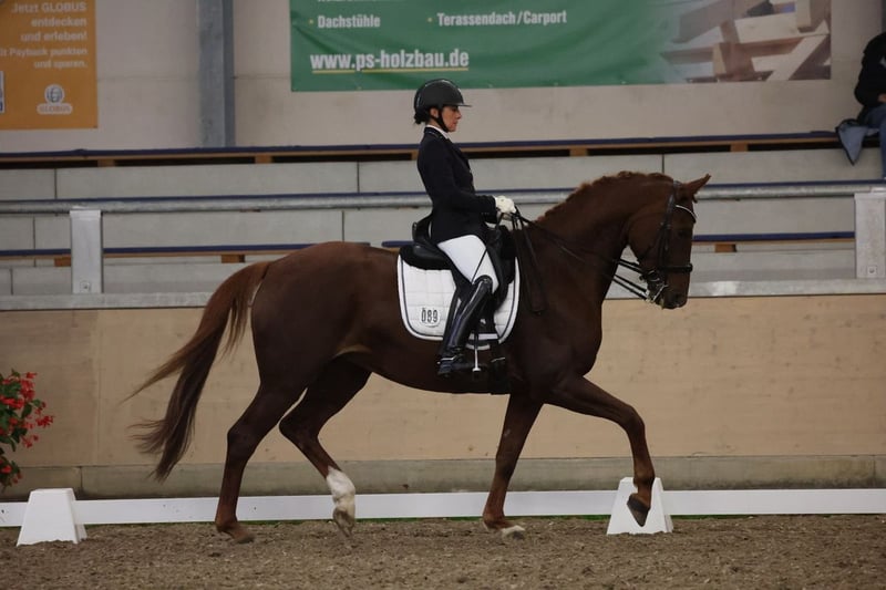 For sale: Baden-Württemberg mare – dark chestnut, born in 2019 Up for sale is an elegant and talented Baden-Württemberg mare, born in 2019. She impresses with her lightness and willingness to perform. She is a promising dressage partner, distinguished by her quality of movement and her character. The mare is people-oriented, attentive, and works motivatedly alongside her rider. Her dark chestnut coat gives her an elegant appearance and makes her a striking presence in the stable and at competitions. She has won medium-level dressage tests and already masters the Grand Prix movements. Please feel free to contact me for more information or if you are interested. I am happy to arrange a viewing and a test ride.