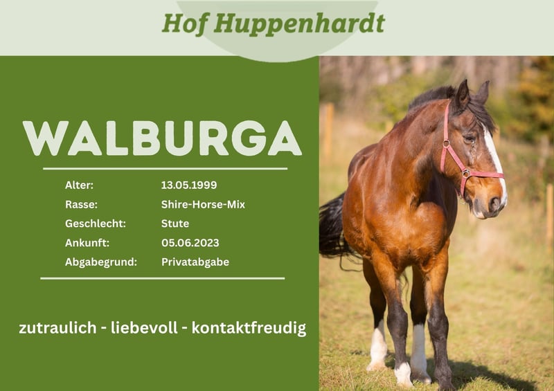 Wir suchen ein neues Zuhause für unsere Barockpferdestute Walburga! Die am 13.05.1999 geborene Stute wurde von uns im Juni 2023 von einer Privatperson übernommen, da diese sie nicht mehr halten konnte. Bei uns zeigt sie sich in der Herde als ranghohe Stute. Sie steht in einem Offenstall, kennt aber auch Boxenhaltung. Bei uns wird sie viel am Boden gearbeitet und liebt Spaziergänge. Dabei ist sie immer klar im Kopf und gut zu händeln! Mit etwas mehr Training wäre sicherlich auch ein gemütlicher Ausritt wieder denkbar. Walburga ist Menschen gegenüber sehr aufgeschlossen und zugewandt. Auch von Kindern lässt sie sich streicheln und putzen! Sie hat eine Cushing Erkrankung, weshalb sie medikamentös eingestellt ist. Auch sind in der Kruppe ein paar Probleme in der Tiefenmuskulaur bekannt, welche sich aber durch richtiges Training unauffällig zeigen. Wir wünschen uns für sie ein neues Zuhause mit eigenen Menschen, wo sie das Pferde-Seniorenleben richtig genießen kann. Wir sind ein Tierheim für Großtiere. Alle unsere Schützlinge werden nach positiver Vorkontrolle und gegen eine Schutzgebühr vermittelt. Gerne können die Tiere nach vorheriger Terminabsprache bei uns auf dem Hof besucht und kennengelernt werden.