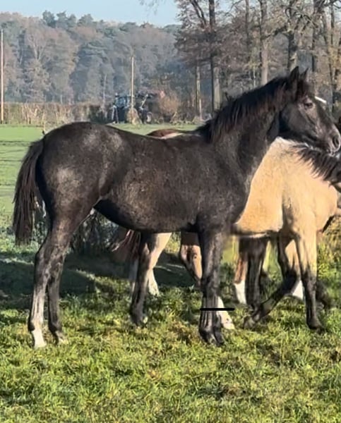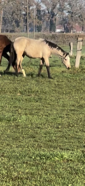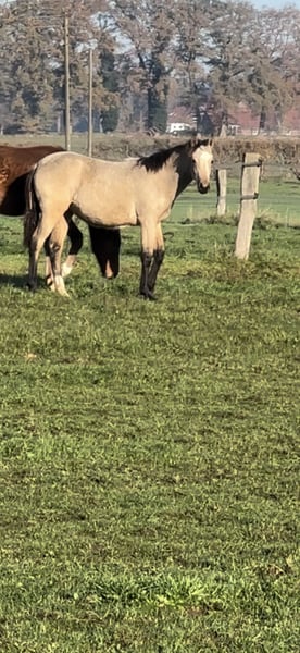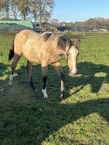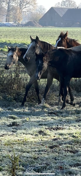 These young mares captivate with their rare buckskin color, correct conformation, and their characteristic baroque expression. They are raised in a herd environment and are age-appropriate well-behaved and easy to handle. Special color: Buckskin Registration papers available Correctly built Expressive, with a full mane The two light buckskin mares are sired by Goldberg Don Schufro. The other two are out of an Arab-Friesian mare. All are registered with the Association for Special Breeds. Prices range from €5,500 to €7,500.