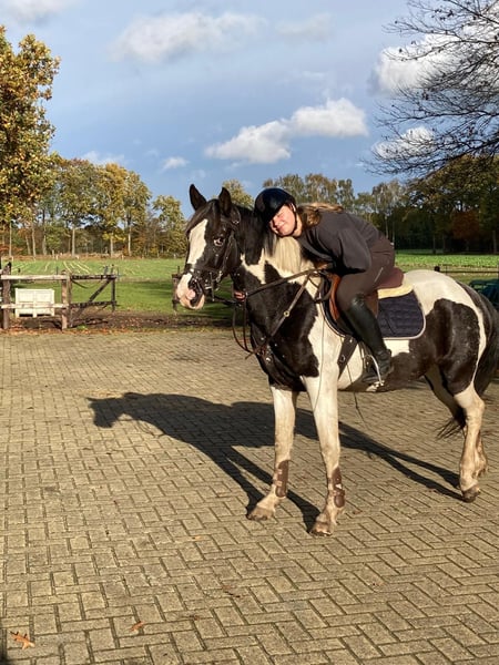 4 jarige Pinto Appaloosa merrie Najaar 2025 zadelmak gemaakt maar nu i.v.m. leeftijd stil gezet om door te groeien. Werkwillige merrie direct van de fokker. Met fries x warmbloed bloed erin 1,55m Ze heeft een jaar in een kleine opfok gestaan met een broer van der. Loopt netjes aan de longe. Leuk mee aan de hand ook over straat netjes. Sky word elk jaar lichter en haar stippen komen er ook steeds meer uit. Niet gekeurd keuren K.K. Videos op aanvraag