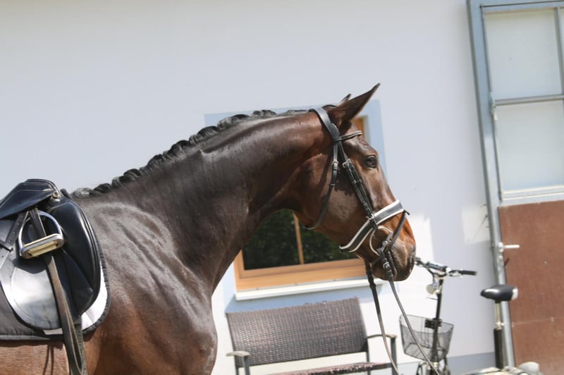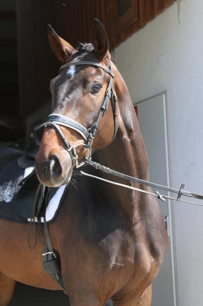 Florentin G por Fidertanz salido de nuestra yegua de primera calidad Florentine combina una gran manejabilidad con muy buenos aires básicos. Pronto estará listo para competir en pruebas para caballos jóvenes de equitación y doma a la edad de 4 años. Es afable y relajado y también le gusta ir fuera de pista. Dispone de buenas radiografías.