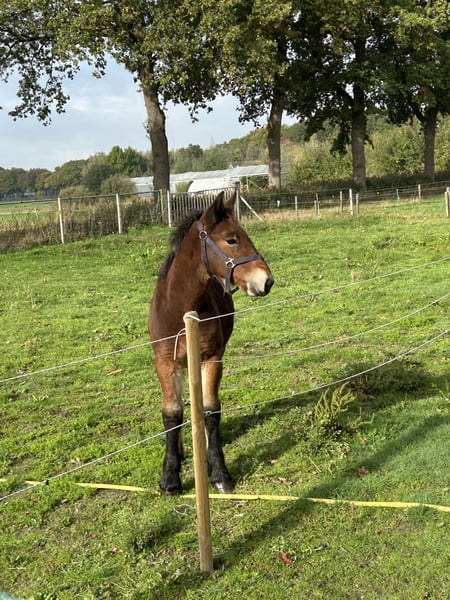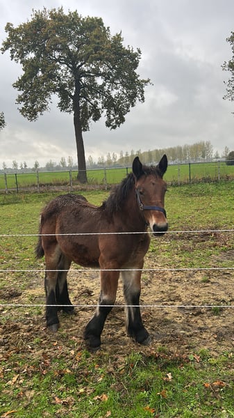 Te koop Prachtig bruin trekpaard hengstveulen. Geboren in 2025, reserve kampioen op de veulenkeuring kvth. Braaf karakter.