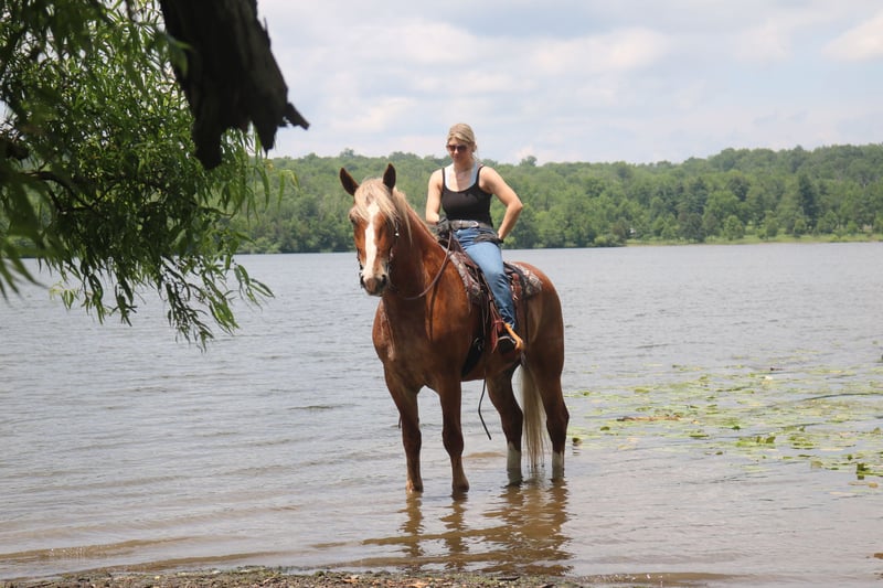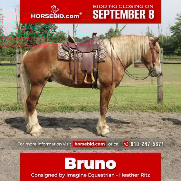 ♦️ 𝐭𝐡𝐞 𝐒𝐞𝐩𝐭𝐞𝐦𝐛𝐞𝐫 𝑺𝒆𝒍𝒆𝒄𝒕 ♦️ Happening now thru MONDAY | SEPTEMBER 8th - Available EXCLUSIVELY on HorseBid's website! For more details and to register visit: www.Horsebid.com CONSIGNOR CONTACT: Imagine Equestrian- Heather Ritz 610-247-5671 LOCATION: Perkasie, PA BREED: Belgian X QH REGISTERED: No COLOR: Sorrel HEIGHT: 16.2 AGE: 5 GENDER: Gelding Bruno Kind, Trailmaster, Overgrown Puppy Dog are three words that immediately come to mind when we think of Bruno. He has an amazing temperament and a sturdy build that makes you want to get lost on the trails all day. 2020 Belgian x QH gelding. Bruno stands at 16.2 with a stocky build. He is sound with no known injuries or maintenance. He is up to date. Bruno is the bottom of a mixed herd. He can be stalled or live out 24/7. He doesn’t crib, bite, kick, or weave. In the barn, Bruno is a gentle giant on the ground. He loves attention and is a big puppy dog. He stands quietly tied, clips, bathes, loads, and is good for the vet/farrier. He has excellent ground manners and is easy to catch. He has a kind gentle demeanor and is always searching you for treats. Undersaddle, Bruno has a smooth walk trot canter. He stands quietly to be mounted from the ground or by a block. He rides both english and western. Bruno will take a jump and is honest to a fence. He is bombproof on the trails and will cross water, bridges, and traffic. He can easily navigate rough terrain and loves to swim. Majority of Bruno’s mileage is outside of the arena and he would love a home where he can be in his happy place the trails. We can’t blame him we prefer to be out trail riding over doing circles all day in the arena too. He would make an excellent foxhunter and is husband and beginner safe. No buck, rear, bolt, or spook.
