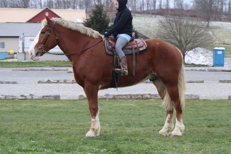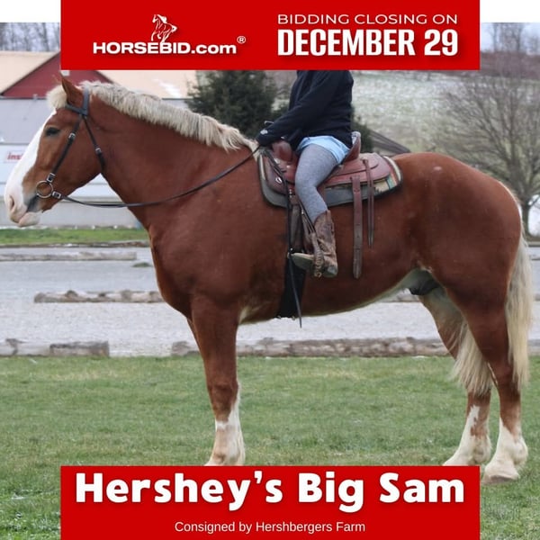 ⚜️𝐓𝐇𝐄 𝓗𝓮𝓻𝓲𝓽𝓪𝓰𝓮 𝐖𝐢𝐧𝐭𝐞𝐫 𝓒𝓵𝓪𝓼𝓼𝓲𝓬⚜️ Happening now thru MONDAY | DECEMBER 29th - Available EXCLUSIVELY on HorseBid's website! For more details and to register visit: www.Horsebid.com CONSIGNOR CONTACT: Hershbergers Farm 330-600-0197 LOCATION: Millersburg, OH BREED: Belgian REGISTERED: No COLOR: Sorrel HEIGHT: 18.1 AGE: 5 GENDER: Gelding Big Sam is the definition of a GENTLE GIANT!! He has a sweet temperament and is just as friendly as a kitten. Sam is just the type of horse that gets along great with any other animals and everybody in the barn loves him. He has been used for lots of different jobs here on the farm. This fall one day we had kids day in our petting area and all the kids got to sit on Big Sam to get their picture taken. Sam had between 300 and 400 kids on his back that day and just loved all the attention and treats he got from them! If you take him out on a trail ride he doesn't mind riding with a group or just go on a solo ride. If you have to open a gate or load the manure spreader or whatever it might be there's no need to tie Sam, he will stand wherever you want him to. He doesn't mind large crowds and big traffic and all kinds of loud noises. Big Sam just has that BIG, PROUD, and IMPRESSIVE walk that grabs everyone's attention. Sam has been driven a lot single or double with another horse and doesn't mind driving on either side of the tongue. He has a nice trot and will also canter if you ask him to. He is very friendly with other animals and wouldn't hurt the tiniest pony!!! If you are looking for that big, gentle, and impressive pet Sam might be the one!! He checks all the boxes!!! Stands to mount! Loads nicely!! Traffic Safe!! Kid Friendly!! Gentle with other animals!! Stands for the farrier!! Easy to clip!! Loves a bath!! DON'T MISS HIM, HERSHEY'S BIG SAM!!!!!