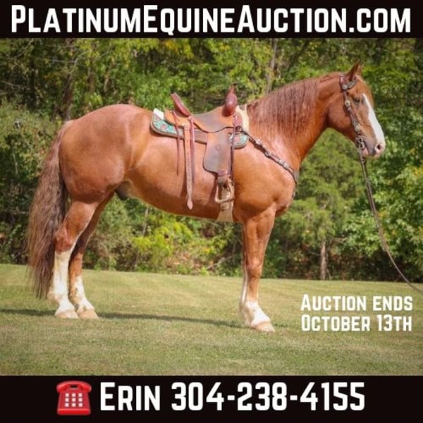 ONLINE AUCTION Place your bids at www.PlatinumEquineAuction.com Starting Bid $3500 Auction ends October 13th, 2024 Need a new saddle? Check out White Rock Saddles on our website or Facebook! This is “ARNOLD”, a big stout muscular BELGIAN QUARTER CROSSBRED that is family friendly, super gentle, and very easy to ride or drive. He is 6 years old and stands 17 hands tall. He is well broke to ride and to work double or single. He has been used to pull carriages and give wagon rides at the pumpkin festivals and Christmas tree farms. He has been ridden by youth riders and will trail ride quietly for beginners. He has also been used for ranch work and is handy when you ask him to be. He will sit down and turnaround nicely and he has a big stop. He moves off of leg cues, sidepasses, and you can open and close gates off of his back. He catches his leads, jogs and lopes nice circles, and will one step lope. He has no hump and no buck. He will cross any depth of water and he is not spooky. He is traffic safe on the roads and unphased by large crowds and noisy surroundings. He unloads in new places quietly and rides off collected and calm. Beginner teamsters can drive him without any problem. He stands to harness and hitch. He loves to work and truly has a pleasant agreeable personality that makes him everyone’s barn favorite. He is super versatile. You can rope off of him, work cattle, trail ride, shown him at the hitch classes, take him on a wagon train, or skid some logs out of the woods. He is a great horse with lots of training, sense, ability, and a ton of heart. Call HH Horses Erin 304-238-4155 Located in Flemingsburg, KY. ONLINE AUCTION Place your bids at www.PlatinumEquineAuction.com Starting Bid $3500 Auction ends October 13th, 2024 Need a new saddle? Check out White Rock Saddles on our website or Facebook!