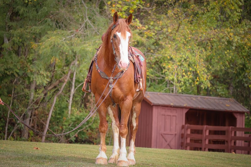 ONLINE AUCTION Place your bids at www.PlatinumEquineAuction.com Starting Bid $3500 Auction ends October 13th, 2024 Need a new saddle? Check out White Rock Saddles on our website or Facebook! This is “ARNOLD”, a big stout muscular BELGIAN QUARTER CROSSBRED that is family friendly, super gentle, and very easy to ride or drive. He is 6 years old and stands 17 hands tall. He is well broke to ride and to work double or single. He has been used to pull carriages and give wagon rides at the pumpkin festivals and Christmas tree farms. He has been ridden by youth riders and will trail ride quietly for beginners. He has also been used for ranch work and is handy when you ask him to be. He will sit down and turnaround nicely and he has a big stop. He moves off of leg cues, sidepasses, and you can open and close gates off of his back. He catches his leads, jogs and lopes nice circles, and will one step lope. He has no hump and no buck. He will cross any depth of water and he is not spooky. He is traffic safe on the roads and unphased by large crowds and noisy surroundings. He unloads in new places quietly and rides off collected and calm. Beginner teamsters can drive him without any problem. He stands to harness and hitch. He loves to work and truly has a pleasant agreeable personality that makes him everyone’s barn favorite. He is super versatile. You can rope off of him, work cattle, trail ride, shown him at the hitch classes, take him on a wagon train, or skid some logs out of the woods. He is a great horse with lots of training, sense, ability, and a ton of heart. Call HH Horses Erin 304-238-4155 Located in Flemingsburg, KY. ONLINE AUCTION Place your bids at www.PlatinumEquineAuction.com Starting Bid $3500 Auction ends October 13th, 2024 Need a new saddle? Check out White Rock Saddles on our website or Facebook!