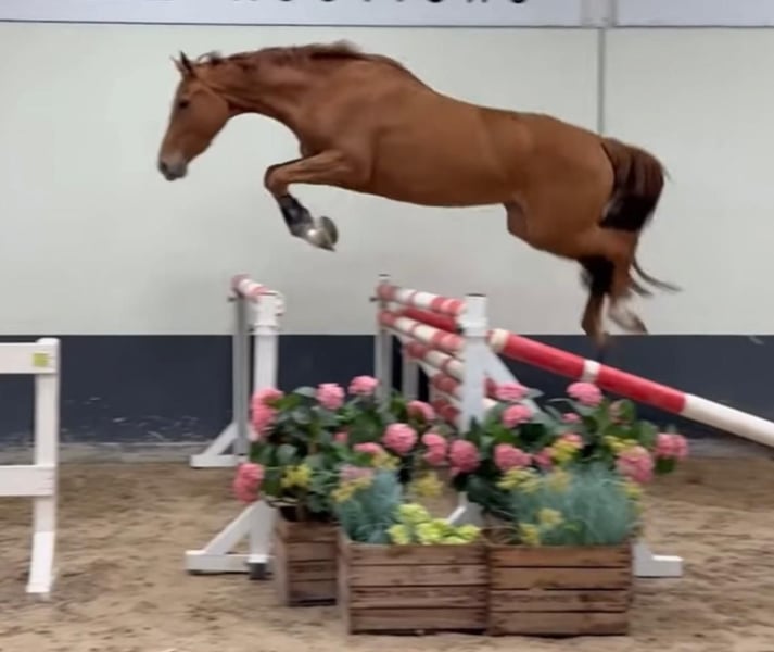 Se ofrece a la venta una hermosa y elegante yegua de 4 años de edad, de color alazán, con un carácter muy dulce, afectuoso y confiado. Recientemente ha sido montada con suavidad y siempre se muestra motivada, dispuesta a aprender y con gran temple. Con una descendencia prometedora en salto y una línea de doma en la parte materna, posee excelentes cualidades para el deporte. Sus tres pasos básicos, firmes y seguros, destacan por su elasticidad y expresividad. Actualmente mide aproximadamente 1,62 m de alzada y aún está en crecimiento. En su trato diario, se muestra sencilla, cercana y curiosa, una auténtica caballo de confianza con encanto y potencial. Ideal para jinetes ambiciosos que busquen un caballo joven con mucho potencial para salto, doma o para un uso versátil.