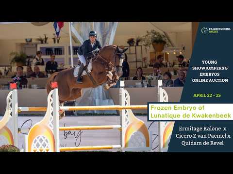 With Ermitage Kalone as sire and Lunatique de Kwakenbeek (Cicero Z van Paemel x Quidam de Revel) as dam, this frozen embryo is bred from a blend of modern athleticism, quick reflexes and scope, backed by a proven performance line. Ermitage Kalone is admired for his elite-level potential and carefulness, qualities that are strongly reinforced here through the influential Cicero Z and Quidam de Revel blood on the dam’s side. Dam Lunatique de Kwakenbeek competed at 1.55m level and descends from Euridyce van de Padenborre (Quidam de Revel x Ramiro Z). The direct family shows real depth, including the 1.60m jumper Jewel de Kwakenbeek (by Cicero Z van Paemel) and multiple sport horses close up the damline. A compelling opportunity for those looking to invest in a future sport and breeding prospect from a family that consistently delivers quality.
