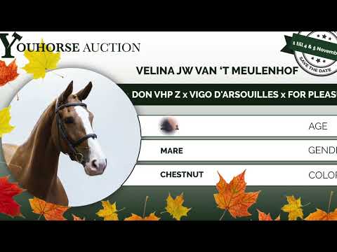 The four-year-old mare Velina JW van ’t Meulenhof competed in the Belgian cycle last summer. She shows scope and good hindleg technique. Sire Don VHP Z was a top earner under the saddle of Harrie Smolders. The impressive son of Diamant de Semilly jumped 1.65m courses with ease and is a half-brother to the 1.60m Grand Prix horses HH Carlos Z and Envoy Merelsnest Z. Six offspring of Don VHP Z have already competed at 1.55m and 1.60m level. Dam Sweet N’Sour JW van ’t Meulenhof (Vigo d’Arsouilles) is seven years old and already competing internationally at 1.45m level with Alexander Butler (IRL). Granddam First Call de Muze (For Pleasure) is bred out of the 1.60m GP mare Call Me De Muze (Clarissimo). Interestingly, Call Me De Muze is bred out of the clone of the famous Ratina Z, Ratina Gamma Z (born 2009). This family has produced many sport horses. This horse was previously auctioned, but as the buyer did not meet his obligations, the payment was never completed. The horse itself is exactly as described. Perhaps it’s no coincidence the previous buyer didn’t pay — this horse was simply meant for you! https://youhorse.auction/en/auction/Velina-JW-van-t-Meulenhof-DON-VHP-Z-x-VIGO-DARSOUILLES-5117