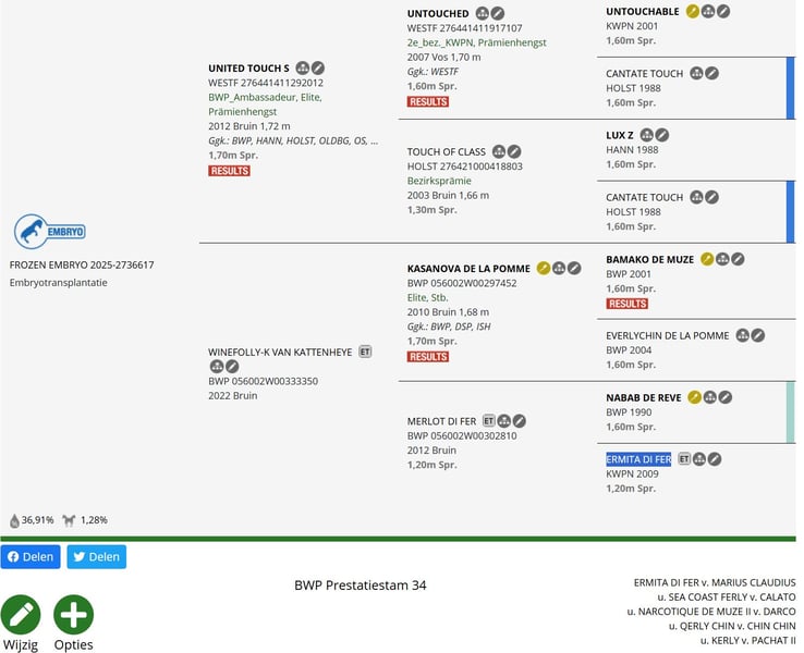 United Touch S × Winefolly K van Katteheye Wij bieden een uitzonderlijk hoogwaardig diepvriesembryo aan, afkomstig van een elitecombinatie van moderne Grand Prix-genetica met een van de meest invloedrijke moederlijnen in de internationale springpaardenfokkerij. Deze combinatie is bewust en exclusief ontwikkeld voor het allerhoogste niveau van de sport (1,60 m / Grand Prix) en is duidelijk gepositioneerd in het topsegment van de markt. Vader: United Touch S Internationale Grand Prix-hengst van 1.60 m Geprijsd op basis van zijn explosiviteit, reflexen, kracht en bloedlijn Vertegenwoordiger van een nieuwe generatie moderne springhengsten Zeer gewild in de professionele sport en investeringsprogramma's Moeder: Winefolly-K van Katteheye Een merrie uit de gerenommeerde BWP 34-moederlijn Nauw verwant aan Qerly Chin, een van de meest invloedrijke stammerries in de moderne springpaardenfokkerij Ook sterk verbonden met de Sea Coast Ferly / Narcotique de Muze II-familie Een moederlijn met bewezen productie van 1.60 m / Grand Prix-paarden Een uitzonderlijk solide genetische basis voor duurzame topsport en fokkerij Technische informatie Status: Diepvriesembryo Opslag: AVENTEA (Italië) – 's werelds nummer 1 centrum voor paardenreproductie Technologie: ICSI / ET – de hoogste reproductiestandaarden Registratie: volledige documentatie, volledige traceerbaarheid (Horsetelex) Profiel: pure sport | Elite Grand Prix-potentieel Ideaal voor: internationale topsportstallen investeerders die zich richten op 's werelds toonaangevende merken fokprogramma's gebaseerd op bewezen merrielijnen Prijs: op aanvraag (hoger prijssegment) Details, documentatie en voorwaarden: op aanvraag Wij bieden volledige ondersteuning, inclusief: advies bij de selectie van de juiste draagmerrie coördinatie van de ICSI- en implantatieprocedures organisatie van het embryotransport naar het geselecteerde implantatiecentrum DeSau Stables Sp. z o.o. Premium sportpaardenfokkerij Polen – België