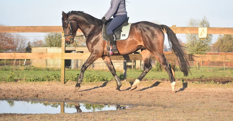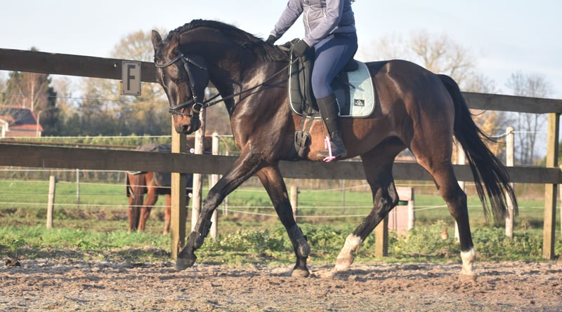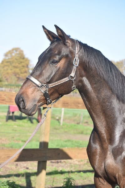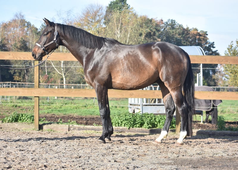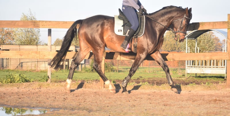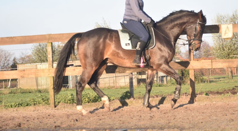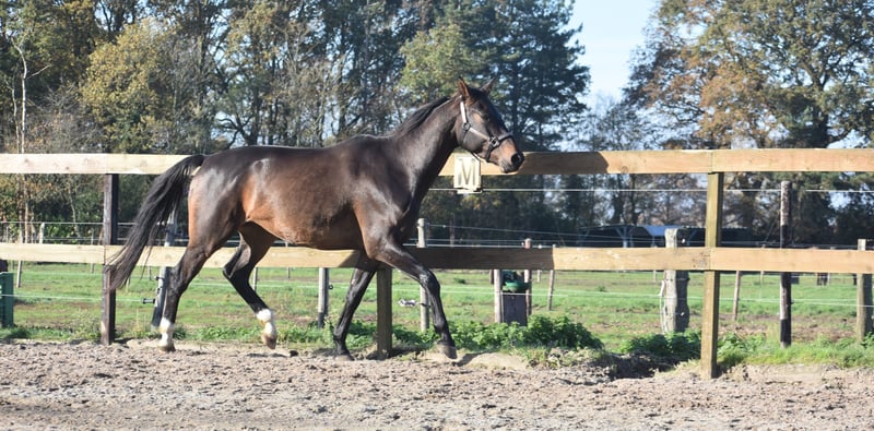 Meet Valesco van de Melane. We had the opportunity to acquire him directly from the breeder, together with his stablemate Voltaire van de Melane. What a gem! A stunning, black-brown 4.5-year-old gelding approximately 1.68 m tall, with an impressive pedigree: Lavillion x Akribori x Ulft. A perfect combination for both dressage and show jumping. Valesco is truly a sweetheart of a horse. In the stable, he attracts attention with his charming demeanor and thoroughly enjoys a cuddle. Under saddle, he demonstrates his willingness to work and his calm, sensible nature. He is very pleasant to ride and gives his rider a comfortable feeling in the hand. He has been radiographically and clinically approved, with healthy legs, back, and neck. With his talent and versatility, Valesco can go in multiple directions. A horse with a bright future, suitable for both sport (dressage + jumping) and recreational riding. He is well-versed in traffic and trailer loading, both currently and previously. Very social. Free of any (stable) vices. Valesco is in excellent health and moves with great cadence, balance, and freedom. Price: €9,750, including a brand-name saddle and bridle.