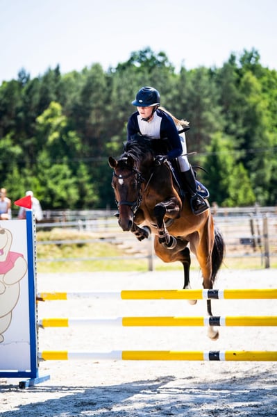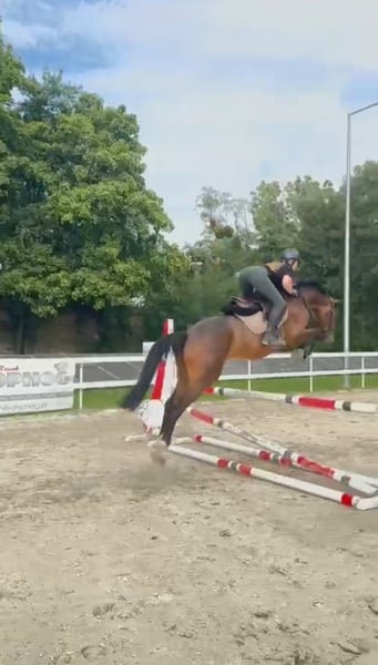 For sale: young, promising gelding (born 2020), bay, height 163 cm. Son of the famous Cornet Obolensky – which already speaks volumes about his enormous sporting potential. The horse jumps lightly and flexibly – "like a ball." Very agile, brave, never stops. He is not afraid of cross rails or colorful obstacles. Currently competing in classes up to L, with great potential for higher classes. This is a horse with the potential for high-level sport, ideal for a child or junior looking for a safe horse that also offers a perspective for development. Very well-mannered, easy to handle, eager to cooperate with the rider, enjoys human contact. The horse is fully healthy, regularly turned out, has a current TUV examination, is systematically shod in front, vaccinated, and dewormed. This is a young horse with an excellent pedigree and a heart for jumping, combining a great character with true sporting talent. Location: Pępowo near Gostyń (63-830) Contact: +48 697 073 043