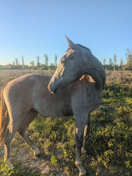 Fohlen mit außergewöhnlichem Charakter. Sehr sanft und in allem äußerst unkompliziert. Sehr gut erzogen, führt an der Hand, Spaziergänge, Überwinden von Hindernissen und schwierigen Passagen, ruhiges Ein- und Aussteigen sowie Reisen. Sehr schöne, ausgewogene Erscheinung, elegante Bewegung. Misst 1,50 m mit 18 Monaten, wird voraussichtlich 1,55 m erreichen.