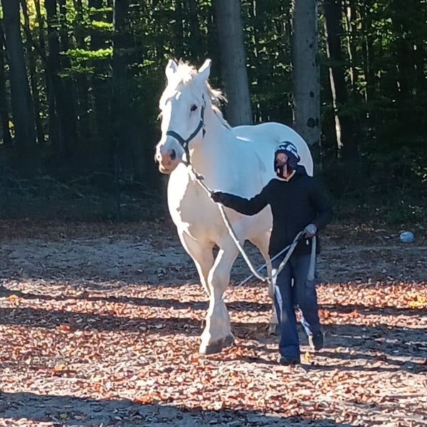 Jimi is a French Boulonnais draft horse with German pedigree documentation (horse passport with breed markings and transponder). His sire is the well-known Boulonnais stallion "Jumper" by Tamme Hanken – familiar to many from television. Born: June 21, 2016 Height: approximately 17.9 hh Vaccinated, dewormed, hoof care every six weeks, no CPL – he has no scratches or mud fever, and his legs are healthy. He has been barefoot for some time now. His eyes are sensitive to wind and tend to water slightly. Jimi has been ridden (see photos): < Dressage work in the riding arena < Trail riding < He also rides out in the field with a lead pony He is broken-in (see photos): < Driven single and pair < Out in the terrain and on the road Jimi also enjoys and is familiar with: < Groundwork < Round pen work < Lunging: walk, trot, canter, and halt are perfect on the lunge line < Desensitization exercises (leading with the horse) < Trailer loading: he stands very calmly and relaxed < Farrier work < Stable and pasture turnout 24/7, as well as open stall management Due to his size, Jimi is not suitable for beginner riders. He is eager to learn and strives to do everything correctly once he has gained trust. He is not a boring horse. We have decided to sell this lovely horse because I have to admit that I am simply too small (1.60 m / 45 kg) for the proper handling and riding of him. Therefore, I am looking for a more suitable owner who can form a better bond with him. If interested, please contact us: 0163 963 84 90