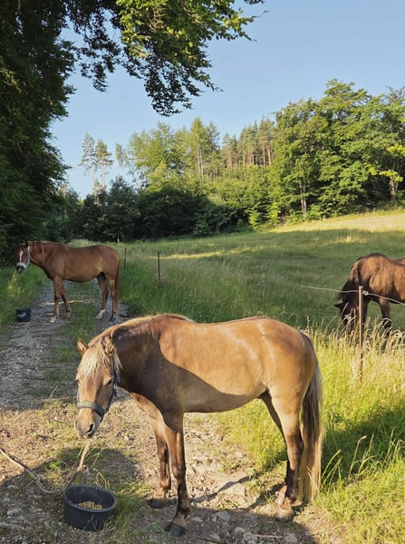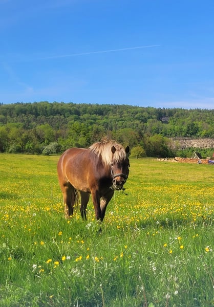 Verkaufe Classic Pony Wallach, 6 Jahre, 1.20m - freizeitgeritten, unerschrocken und charakterstark Zum Verkauf steht Joka, bei uns seit 2021 und im Herdenverband aufgewachsen, absolut sozial und verträglich. Er verfügt mit 1.20m über eine attraktive Größe und ist ein selbstbewusstes und willensstarkes Pony - kein reines Anfängerpony. Trotz eigenem Charakter ist er absolut gutartig, unerschrocken und 100% verkehrssicher, zeigt sich im Umgang ruhig und souverän. Joka ist freizeitmäßig im Gelände geritten, mit und ohne Sattel, von Kindern und einer leichten Erwachsenen. Er ist geimpft und regelmäßig entwurmt, die Zähne wurden 2025 komplett gemacht. Er steht im Paddock Trail und kennt Heu ad libitum, was er gut verträgt. Aufgrund einer höheren Rehe-Sensibilität wird er nicht in reine Wiesenhaltung abgegeben; stundenweiser Koppelgang ist jedoch unproblematisch. Joka wurde bislang nicht gefahren, bringt dafür aber beste Voraussetzungen mit: Er ist gelassen, lerneifrig und nervenstark. Die Ausrüstung kann auf Wunsch mitgegeben werden. Für Joka wird ein passender, ponygerechter Platz gesucht. Platz vor Preis! Für ein Probereiten wird eine Gebühr von 30,- Euro erhoben, die beim Kauf verrechnet wird. Bei Interesse freue ich mich über eine aussagekräftige Anfrage mit kurzer Vorstellung. Privatverkauf ohne Sachmängelhaftung. Garantie oder Gewährleistung wird nicht übernommen.
