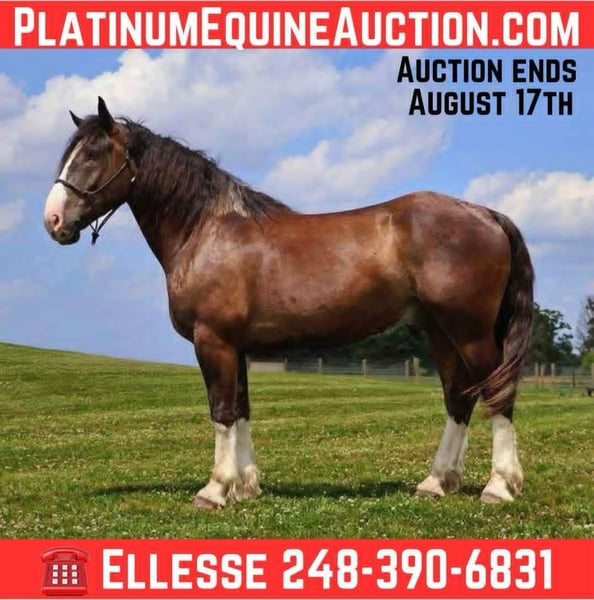ONLINE AUCTION Place your bids at www.PlatinumEquineAuction.com Starting Bid $3500 Auction ends August 17th, 2025 Need a new saddle? Check out White Rock Saddles on our website or Facebook Introducing Chocolate. This 6 year old 17hh Gypsy, Shire, QH cross gelding has it all. From his captivating personality to his stunning conformation and color. Chocolate lacks nothing. Chocolate is the type of horse who wants to be your best friend. He plays well with all the others outside and will catch you when you walk to the pasture. Chocolate is extremely well broke. He walk, trots, canters and stops on a dime. His transitions are flawless both upward and down. His lope is like sitting on a rocking chair. Chocolate steers off seat and leg so well you don’t even need a bridle. He will gladly take a bit, snaffle or shank he’s not fussy or just pull the bridle right off and he steers with all leg ques. This horse has taught many first time riders and they adore his calm nature. He builds you up every ride and makes you want to get on. Chocolate has loads of experience out on the trails from the mountains of MO to the open fields of MI he’s seen it. Water, deep woods, roads, wildlife no problem. Chocolate has been ridden in groups of 40 horses. He will take any place you ask in the group and is not one to get worked up. He’s also been out alone. Chocolate has been used to round up and rope heard’s of wild cattle as well. He’s been driven single and double. He has a great amount of training in the arena. He knows all the cool dressage moves thru 1st level and even jumps! Over fences he screams Hunter as he walks down the lines and tucks his knees right up. He’s completed our desensitizing program. Chocolate is the horse to teach you the ropes, the one you can depend on and he’s loaded with personality. He is sure to win you over with one glance into his big hazel eyes! Chocolate lives in Howell, MI. Please call or text Ellesse Schwartz at 248-390-6831 ONLINE AUCTION Place your bids at www.PlatinumEquineAuction.com Starting Bid $3500 Auction ends August 17th, 2025 Need a new saddle? Check out White Rock Saddles on our website or Facebook