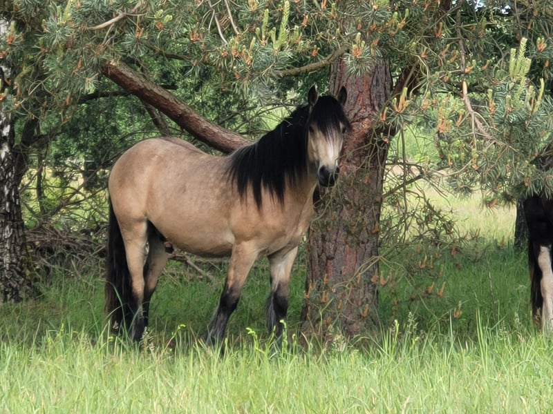 Direkt vom Züchter! 3jähriger Tinker Wallach in Sonderfarbe buckskin, Falbe, Gelbfalbe, Goldfalbe. Justus ist in seiner Familien-Herde aufgewachsen und hatte nur besten Umgang. Er ist schmiedefromm, verladefromm und kennt bereits Bodenarbeit. Auch läuft er bereits ohne Last vor der Kutsche mit. Noch ist er hinten überbaut und im Wachstum. Da Tinker Spätentwickler sind, sollte er erst 4jährig geritten werden. Vor der Kutsche kann er jetzt schon arbeiten und Muskeln aufbauen. Irish Cobs sind keine Gewichtsträger. Zu 25% ist er Altmärker Kaltblut. Ausgwachsen sollte er 70 Kilo tragen können. Um ihn zu reiten bin ich aus gesundheitlichen Gründen leider in den letzten 2 Jahren zu schwer geworden. Ich wünsche ihm einen Mensch, der ihn liebt und zu schätzen weiß. So ein Pferd wie ihn habe ich mir immer gewünscht und er hat bisher viel Aufmerksamkeit bekommen und fordert diese auch.