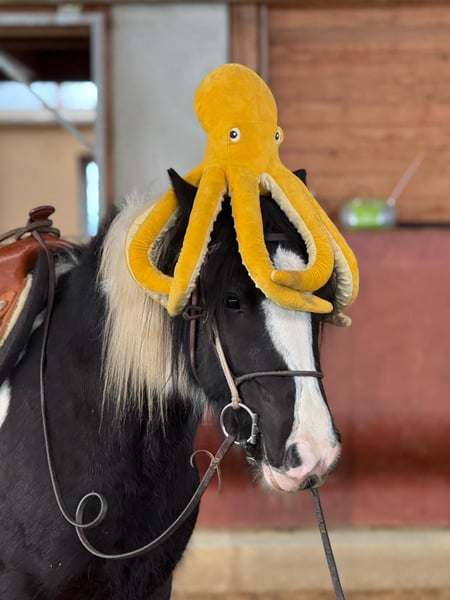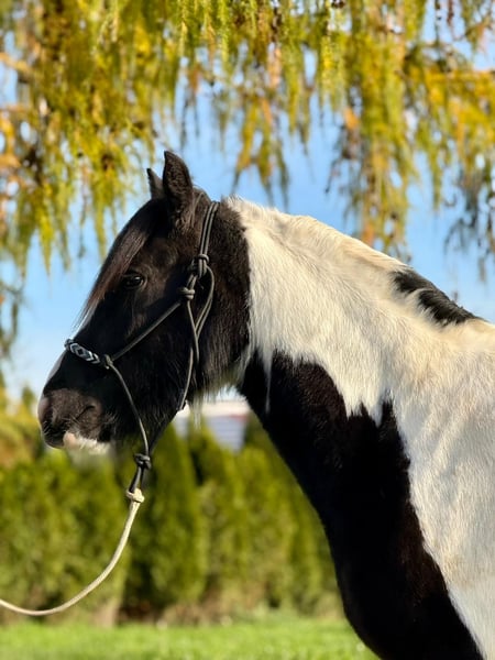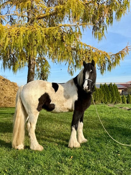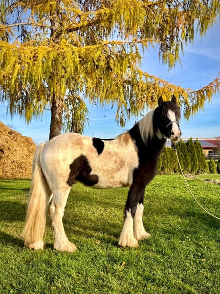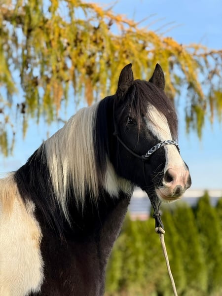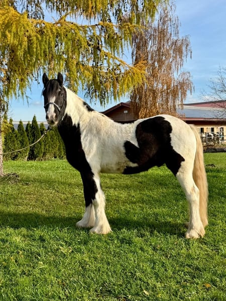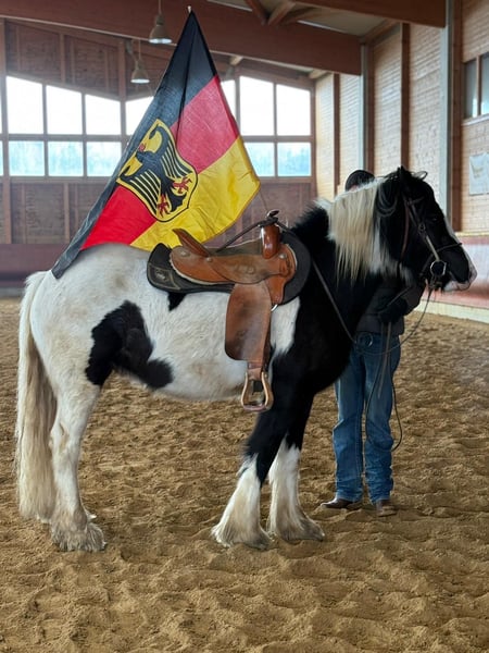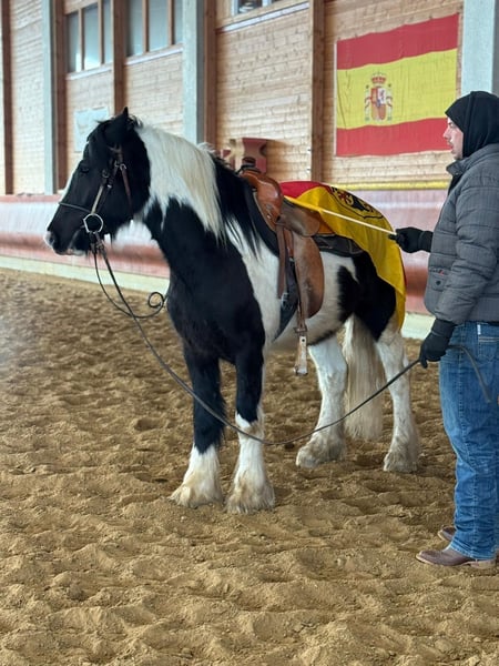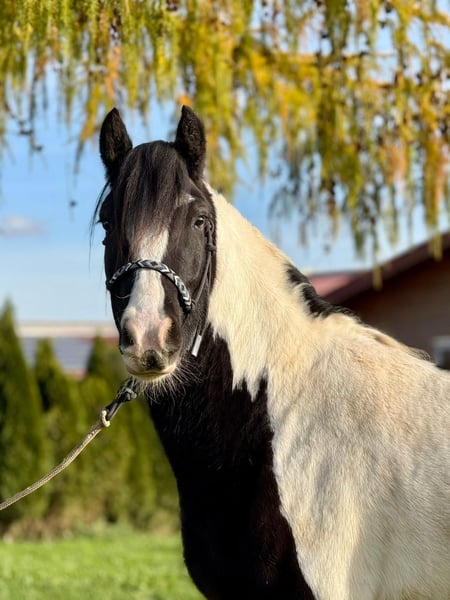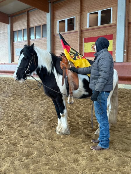 Donald ist ein 4-jähriger Irish Cob mit einem aktuellen Stockmaß von ca. 1,53 m. Er befindet sich in der Ausbildung und ist angeritten. Im Schritt und Trab zeigt er sich bereits sicher und gelassen. Donald bringt eine kleine AKU ohne Befund mit, ist verladefromm sowie schmiedefromm und im täglichen Umgang unkompliziert. Er kennt Bodenarbeit und Gelassenheitstraining und zeigt sich dabei aufmerksam und lernwillig. Charakterlich ist Donald ein Pferd, das durch seine offene und freundliche Art überzeugt. Er ist neugierig, beobachtet seine Umwelt aufmerksam und geht neuen Situationen interessiert entgegen. Menschen gegenüber zeigt er sich sehr zugewandt, sucht den Kontakt und genießt jede Form von Zuwendung, ohne dabei aufdringlich zu sein. Insgesamt wirkt er ausgeglichen, ehrlich und angenehm im Umgang – ein Pferd, das gerne mitarbeitet und seinem Menschen vertraut. Donald eignet sich ideal für jemanden, der ein Pferd mit solidem Fundament sucht und Freude daran hat, die weitere Ausbildung gemeinsam zu gestalten. Gerne kann Donald nach dem Kauf bei uns zur weiteren Ausbildung bleiben. In Verbindung mit begleitendem Reitunterricht besteht die Möglichkeit, dass Pferd und neuer Besitzer Schritt für Schritt zusammenwachsen und sich gemeinsam weiterentwickeln – in ruhiger Atmosphäre und mit individueller Betreuung. Ein Pferd für Menschen, die Wert auf Charakter, Ruhe und eine saubere Ausbildung legen. Bei Interesse melden Sie sich gerne unter der 0160-5482960 (auch via WhatsApp erreichbar).