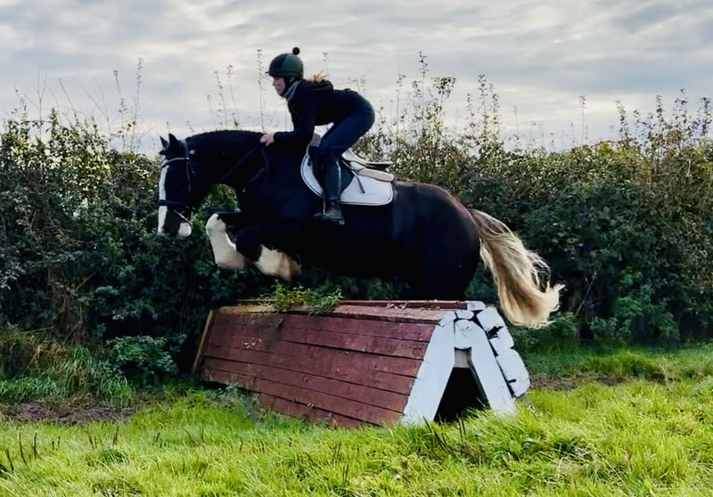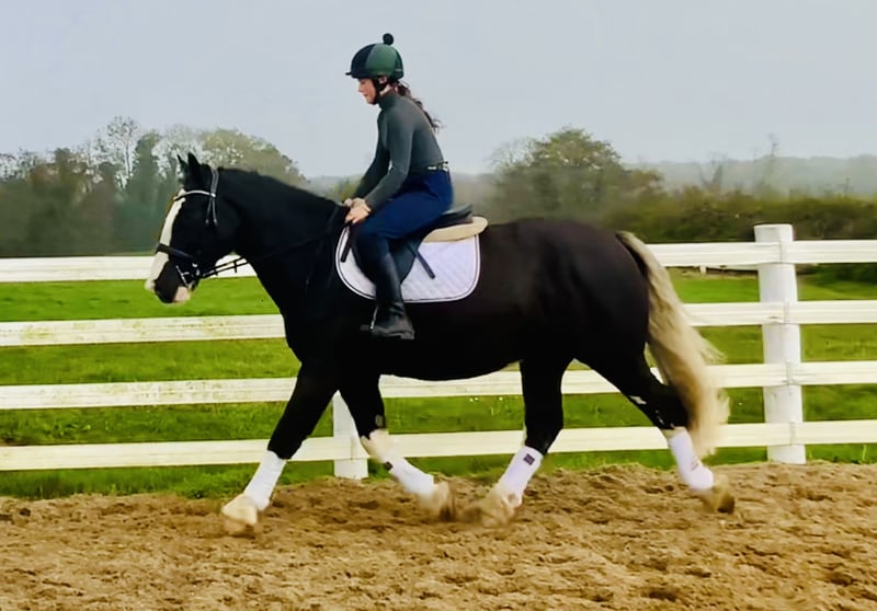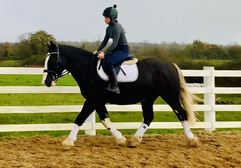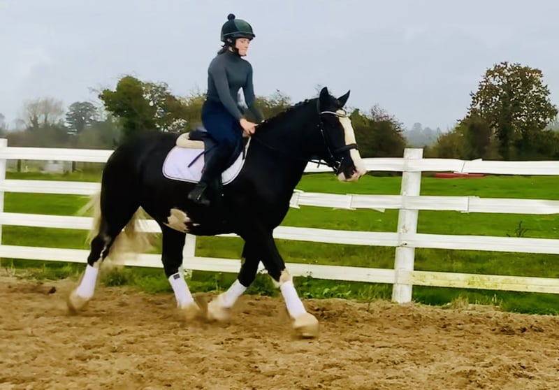 Oreo, a striking nearly 5-year-old cob gelding standing approximately 16.1 hands. Oreo is a truly impressive horse with a beautiful, well-balanced conformation and an extraordinarily elegant appearance. His stunning white tail gives him a unique look that turns heads everywhere – he is one of those horses that simply catches your eye because of his presence and charm. With his distinctive markings and harmonious build, Oreo exemplifies a well-formed cob – combining strength, balance, and quality in an impressive package. Oreo has a wonderful temperament and is a genuine sweetheart to handle. He is friendly, gentle, and always eager to please his rider – an ideal partner for riders of various experience levels. He is regularly ridden by riding school students and takes everything in stride, demonstrating patience and a calm, sensible character that immediately inspires trust. He is ridden in a simple bit, is easy to handle, and responds delicately to aids – providing a comfortable, confidence-inspiring ride every time. In the field, Oreo is a dream – whether alone or in a group, he is traffic-safe and relaxed. He is very familiar with farm machinery and country life, making him an excellent choice for relaxed hacks through paths, fields, or open terrain. Oreo is also a straightforward horse for hunting – sensible in open country, polite in a group, and always focused on work. Oreo has been carefully trained on the flat, over jumps, and in the field. He is honest and brave at jumping, with a good natural rhythm, and already confidently jumps up to 90 cm. With his three balanced, comfortable paces and his motivated, positive attitude, he shows great potential as a versatile all-rounder. He is the kind of cob that is suitable for everything – from hacking and hunting to riding club activities or simply enjoying pleasant days in the countryside. He is very straightforward to handle in every way – good with the farrier, loading, catching, riding, and in traffic. Oreo has no stable vices and is open to any veterinary examination. His calm, adaptable nature would suit many different homes: he would make a fantastic mother-daughter horse, a great addition to a riding school, or a reliable, cheerful leisure partner for someone seeking an uncomplicated, pleasant horse. The price includes delivery to your yard anywhere in the United Kingdom, and we offer an exchange if you are not completely satisfied. Scroll down to watch his video and see for yourself what a lovable and honest horse Oreo is. For more information or to arrange a viewing, please feel free to call me anytime at +353 86 8077626 or email gertytynan@gmail.com. Oreo is the complete package – handsome, friendly, and honest – a beautifully built cob that will be a truly wonderful all-round partner for someone.