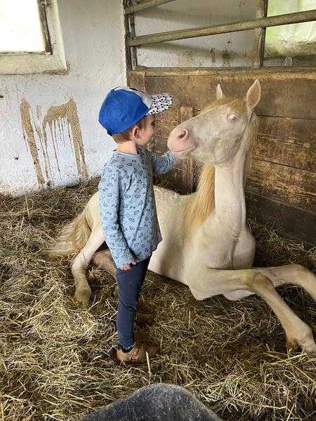 AZORES CASHEL AZORES CASHEL est née le 21.04.2021 dans la belle Irlande chez Joe Burke, un des éleveurs de Connemara les plus renommés d'Irlande, elle a un pedigree de rêve. Azores Cashel son statut HWSD est N/ HWSD ! Actuellement, Azores mesure 1,47 m et nous pensons qu'elle atteindra environ 1,52 m ! Son père SHANBO RORY de la fameuse lignée RORY RASPUTIN est marié avec le sang très recherché de THUNDERBOLT et CARNA BOBBY ! La mère MARA CASHEL a également dans ses gènes du sang noble de performance et de spectacle, associé au meilleur sang de saut d'obstacles ! DRUMBAD FLETCHER MOSS Son père est issu du célèbre FREDERIKSMINDE HAZY MATCH. CURRACHMORE CASHEL, OISIN, CUCHULAINN, BRIDGE BOY et bien d'autres lignées intéressantes sont présentes dans notre Azores Cashel. Complètement ABBEYLEIX OWEN libre ! Azores Cashel est une magnifique jument Cremello claire (BEC) avec un caractère très doux et adorable, très proche de l'homme et désireuse d'apprendre ! Azores Cashel a de très bonnes nerfs, elle est maintenant à l'aise sur la route et dans le trafic en fonction de son âge ! Il n'a pas peur des gros véhicules et des machines ! Conduit des camions et des vans, est sage chez le vétérinaire et le maréchal-ferrant, a pour l'instant encore des problèmes pour donner les sabots longtemps à cause de la croissance à l'arrière chez le maréchal-ferrant ! Mais le grattage des sabots fonctionne bien ! Azores Cashel est entièrement vacciné contre le tétanos, la grippe équine et l'EHV1,4 et peut donc être transféré dans n'importe quelle écurie ! Azores Cashel a de très bons sabots et vit actuellement dans l'écurie des juments. Azores Cashel connaît le travail au sol, le saut en liberté, le travail en liberté dans le roundpen, la longe avec clôture, le travail avec barres et les promenades en extérieur ! En raison de son développement, elle n'est pas encore débourrée, car elle est actuellement en pleine croissance. Azores Cashel possède 3 très bonnes allures avec une bonne amplitude et une bonne cadence, ainsi qu'une très bonne capacité de saut ! En raison de sa taille et de sa croissance, c'est un cheval idéal pour quelqu'un qui veut acquérir un bon cheval et le débourrer tard en hiver ou au printemps prochain, ou idéalement plus tard encore ! Azores Cashel est une jument adorable et très sociable qui s'adapte à tous les troupeaux ! Vous trouverez le pedigree complet d'Azores ici sous Documents, car Ehorses a tendance à avaler des parties du pedigree. Azores vit actuellement en fonction de son âge dans un troupeau de juments d'âges mélangés en stabulation libre ! Nous demandons un forfait de 70 € le dimanche et les jours fériés et de 50 € les jours ouvrables pour chaque visite de notre exploitation. Ce forfait comprend un maximum de 3 chevaux à voir. Les forfaits de découverte doivent être payés à l'avance lors de l'arrivée et remboursés lors de l'achat ! Si vous aimez Azores Cashel, contactez-nous directement aux numéros indiqués dans l'annonce en indiquant votre nom complet et votre numéro de téléphone portable dans votre e-mail. Vous pouvez également nous contacter directement par Whatsapp à l'adresse 00491713415878. Dans notre belle ville, la téléphonie mobile ne fonctionne malheureusement pas ou très mal ! Merci beaucoup pour votre intérêt ! Votre haras de Lisbergs - Lisbergs vaut toujours un voyage - Restez en forme et en bonne santé Haras de Lisbergs
