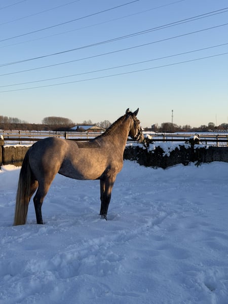 Clonneeagh Lady Grey, roepnaam Lady, is een mooie Connemara merrie, geboren op 5 mei 2021. Met haar stokmaat van 1.47,8 m en haar aansprekende schimmelkleur is zij een echte verschijning. Lady is momenteel uitgebracht op B-niveau en toont zich een fijne en werkwillige pony, met name geschikt voor de dressuursport. Zij beschikt over een goede voorwaartse instelling en denkt altijd mee naar voren, wat haar een prettige pony maakt om verder op te leiden. Mogelijk ligt er ook aanleg voor de springsport, maar hier is wegens andere ambities nog niet mee gewerkt. In de omgang is Lady een uitermate brave en makkelijke pony. Ze loopt keurig met je mee, kan samen met een andere pony worden meegenomen en is zeer sociaal naar andere paarden. Ze staat momenteel dagelijks samen met twee andere pony’s in de paddock en is hierin probleemloos. Lady is braaf bij de dierenarts en hoefsmid en kent geen gebreken. Zij is recent klinisch goedgekeurd; herkeuren is toegestaan, kosten koper. Door haar betrouwbare karakter is Lady geschikt als pony voor een kind met enige rij-ervaring. Ze is eerlijk en doet niets onverwachts, maar omdat zij een actieve en voorwaartse pony is, is het belangrijk dat de ruiter voldoende zelfvertrouwen heeft en stevig in zijn of haar schoenen staat. 📍 Prijs: €15.000 📍 Ras: Connemara 📍 Geslacht: Merrie Een eerlijke, brave en sportieve pony met een fijne instelling, die klaar is om samen met haar ruiter verder te groeien in de sport.