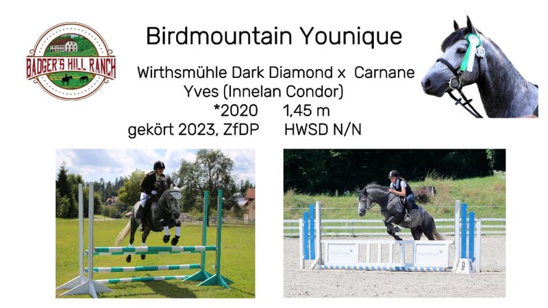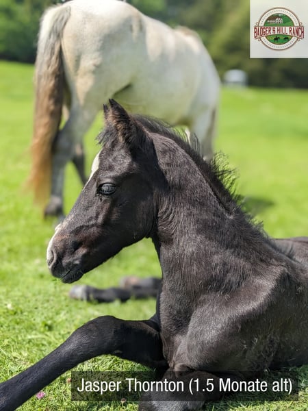 Dein zukünftiger Sport- und Freizeitpartner - Badger’s Hill Jasper Thornton: Jasper ist ein einjähriger Connemara-Jungwallach mit ruhigem, freundlichem Wesen und starker Menschenbezogenheit. Er ist ausgeglichen, angenehm im Umgang und lernt gerne - damit eignet er sich gut für Kinder, Einsteiger sowie ambitionierte Freizeit- und Turnierreiter. Seine eleganten, harmonischen Grundgangarten und seine gute Selbsthaltung machen ihn besonders geeignet für die Dressur. Er bewegt sich leichtfüßig und taktsicher. Seit Kurzem wird Jasper altersgerecht an das Freispringen herangeführt. Dabei zeigt er sich konzentriert, interessiert und mit sichtbarer Freude bei der Sache - ein spannender Ansatzpunkt für seine weitere Entwicklung. Als Reservesieger beim ZfdP Fohlenchampionat Baden-Württemberg 2024 konnte er bereits früh seine Qualität und Ausstrahlung zeigen. Basisdaten Geburtsdatum: 05.05.2024 Geschlecht: Wallach Geburtsort: Badger's Hill Ranch, Dachsberg, DE (nahe der Schweizer Grenze) Stockmaß: Voraussichtlich ca. 145 cm Farbe: Rappschimmel HWSD-Status: N/N Zuchtverband: ZfDP, Connemara Pony Titel: Reservesieger beim ZfdP Fohlenchampionat Baden-Württemberg, September 2024 in Dunningen Preis: EUR 6.000 Blutlinien Vater Birdmountain Younique (145 cm, Bundessieger 2024 in Kat. 3-4-jährige Hengste) Mutter Niamh Thornton (Graufalbe, 144 cm, Reservesiegerin beim ZfdP Stutenchampionat Baden-Württemberg) Vater der Mutter Coolin America (147 cm, bekannt für viele Nachkommen in Irland, u. a. Coosheen Stormboy) Vater Birdmountain Younique ist ein herausragender Connemara-Hengst, der 2024 als Bundessieger in der Kategorie der 3-4-jährigen Hengste ausgezeichnet wurde. Mit seinen harmonischen Proportionen, einem gut aufgesetzten Hals und stabilen Gliedmaßen besticht er nicht nur durch geschmeidige und ausbalancierte Bewegungen, sondern auch durch ein ausgeglichenes Temperament. Younique ist vielseitig einsetzbar und ideal für sowohl ambitionierte als auch Freizeitreiter. Seine Nachkommen, darunter Jasper, zeigen seine besten Eigenschaften - Eleganz, Freundlichkeit und eine harmonische Körperstruktur. Mutter Niamh Thornton ist eine elegante und anmutige Connemara-Stute, die 2024 als Reservesiegerin beim ZfdP Stutenchampionat Baden-Württemberg ausgezeichnet wurde. Sie zeichnet sich durch ihre geschmeidigen Gänge und ihr freundliches Wesen aus, was sie sowohl für Dressur als auch für Ausritte besonders geeignet macht. Mit ihren exzellenten Blutlinien, die auf bekannte Connemara-Hengste wie Coolin America und Coosheen Stormboy zurückgehen, zeigt sie eine bemerkenswerte Vielseitigkeit. Niamh ist eine zuverlässige Partnerin, die stets ihr Bestes gibt und auf ihren Reiter vertraut. Charakter Jasper ist sanft, unterwürfig und bildet starke Bindungen zu Menschen. Sein ausgeglichenes Temperament macht ihn zu einem idealen Partner vom Einsteiger bis zum fortgeschrittenen Reiter. Er ist leicht zu handhaben, freundlich und zeigt keine Unarten wie Schlagen oder Beißen. Gleichzeitig entwickelt er sich charakterlich genau wie seine Eltern: zuverlässig, feinfühlig und kooperativ. Im täglichen Umgang zeigt er sich aufmerksam, anhänglich und stets offen für neue Aufgaben. Bewegung Jasper überzeugt mit geschmeidigen und eleganten Bewegungen, die ihn besonders präsentabel und ideal für die Dressur machen. Sein eleganter, raumgreifender Trab fällt besonders positiv auf. Seit Kurzem wird er ans Freispringen herangeführt - mit großer Freude und hoher Konzentration ist er bei der Sache. Seine proportionale Konformation und schönen Gänge wurden bereits durch seinen Titel als Reservesieger beim ZfdP Fohlenchampionat bestätigt. Ausbildung & Training Jasper wird regelmäßig in der Führanlage altersgerecht bewegt, um Kondition und Muskulatur aufzubauen. Zusätzlich wird er mit Bodenarbeit und kleinen Herausforderungen spielerisch gefördert - stets ruhig, aufmerksam und mit viel Vertrauen zum Menschen. Jasper nimmt regelmäßig an Ausritten und Spaziergängen mit anderen Pferden und Ponys teil. Er ist gut erzogen, lässt sich problemlos führen, striegeln und wird regelmäßig geimpft sowie entwurmt. Seine Hufe werden regelmäßig geschnitten, und er hat bereits mehrere Anhängerfahrten mit Bravour gemeistert. Haltung Jasper wächst auf den weiten, naturbelassenen Weiden des Schwarzwaldes auf, was seine Trittsicherheit und Kondition stärkt und ihm ein starkes Immunsystem verleiht. Aktuell lebt Jasper in einer harmonischen Jungpferdegruppe mit gleichaltrigen Freunden und Halbgeschwistern. Die großzügige Offenstallhaltung mit täglichem Weidegang unterstützt seine gesunde körperliche und soziale Entwicklung. Diese Umgebung fördert seine soziale Entwicklung und stärkt seine Fähigkeiten im Umgang mit anderen Pferden. Standort & Weitere Informationen Jasper befindet sich in Dachsberg, DE, sehr nahe an der Schweizer Grenze. Auf Wunsch können wir den Import in die Schweiz arrangieren. Für weitere Informationen und Fragen stehen wir Ihnen gerne zur Verfügung.
